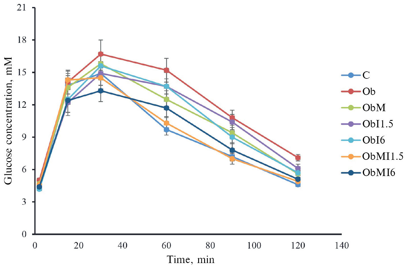По достижении самцами крыс возраста 4 месяцев оценивали развитие ожирения и признаков МС, для чего проводили интраперитонеальный глюкозотолерантный тест (иГТТ). В ходе иГТТ животным в/б вводили глюкозу в дозе 2 г/кг массы тела, при этом измеряли уровни глюкозы в крови до и через 15, 30, 60, 90 и 120 мин после глюкозной нагрузки. Концентрацию глюкозы измеряли с помощью тест-полосок «One Touch Select» (США) и глюкометра («Life Scan Johnson & Johnson», Дания). Наряду с этим оценивали массу тела животных (мониторинг этого показателя осуществляли ежемесячно, начиная с одномесячного возраста). В группу с развившимся ожирением были включены крысы с массой тела, повышенной не менее чем на 10% в сравнении со средним показателем массы тела в контрольной группе, которая получала стандартный корм, и уровнем глюкозы через 120 мин после глюкозной нагрузки в иГТТ не менее 6.5 ммоль/л. Из выборки были также исключены два животных с массой тела, превышающей контрольные значения более чем на 30%. Тем самым из первоначальной выборки были отобраны около 65% животных, которых затем рандомизировали на экспериментальные группы. Были сформированы контрольная группа (C) и 6 экспериментальных групп – ожирение без лечения (Ob), ожирение с трехнедельным лечением МФ в суточной дозе 100 мг/кг (ObM) или двумя суточными дозами ИВИ – 1.5 и 6.0 МЕ/кг (ObI1.5, ObI6), ожирение с трехнедельным лечением совместно с МФ в суточной дозе 100 мг/кг и ИВИ в двух суточных дозах 1.5 и 6.0 МЕ/кг (ObMI1.5, ObMI6). В каждой группе было по 6 животных. МФ растворяли в воде и вводили перорально через желудочный зонд, инсулин растворяли в 0.1 М Na-цитратном буфере (pH 4.5) и вводили по каплям в обе ноздри (в каждую по 10–20 мкл) [26]. Крысы групп C и Ob вместо препаратов получали их растворители.