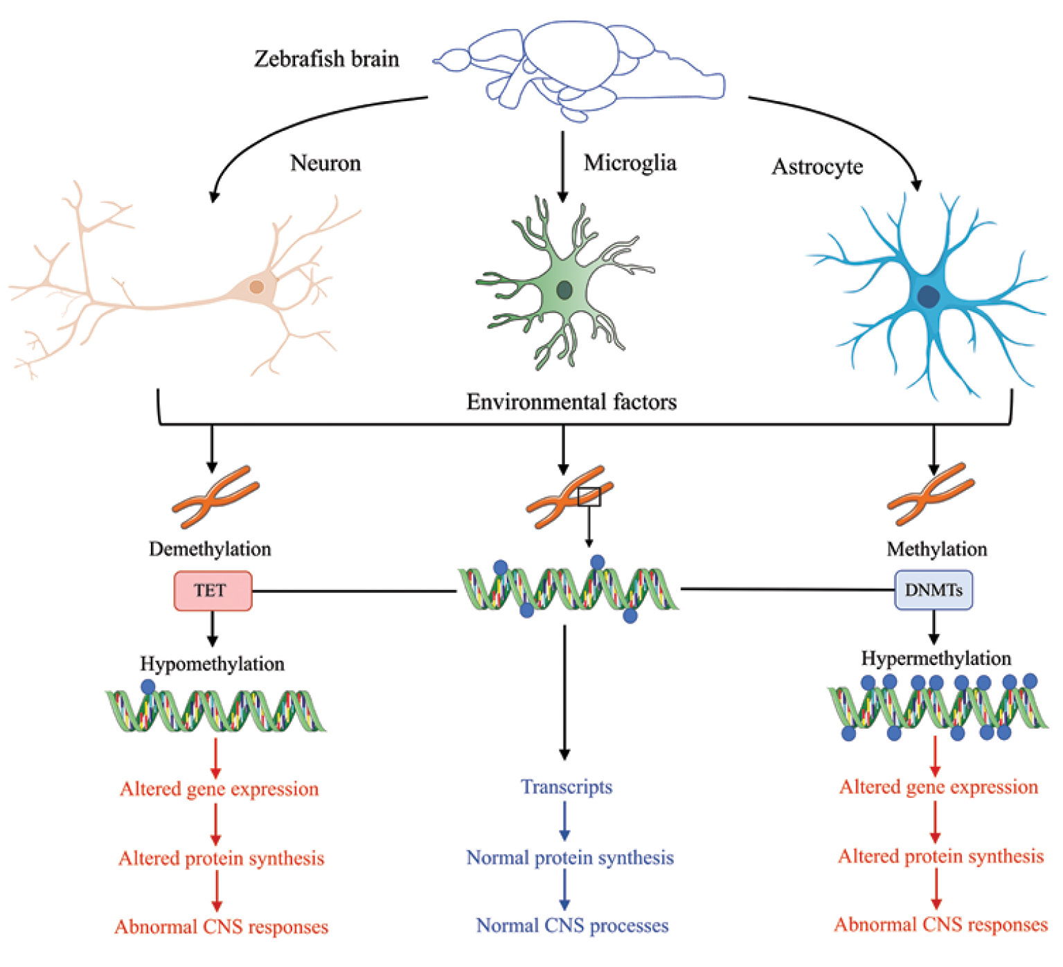 Зебраданио являются логичной моделью для изучения метилирования ДНК, поскольку основные эпигенетические механизмы эволюционно консервативны у всех позвоночных [30] (рис. 3). На данный момент существуют данные о влиянии метилирования ДНК на развитие нервной системы зебраданио, миелинизацию олигодендроцитов и дифференцировку нервных клеток при развитии нервной трубки (снижение метилирования ДНК и гиперацетилирование H3K27 под воздействием морфина) [31]. Также показана зависимость метилирования ДНК и нейропротекции, нейропластичности (снижение выработки нейротрофина BDNF под воздействием морфина), пролиферации нейронных предшественников (в результате дисфункции лизин(К)-метилтрансферазы 2А, KMT2A, поддерживающей экспрессию различных генов), а также опухолеобразования в ЦНС зебраданио (в связи с нарушением экспрессии генов MYCN и ALK, кодирующих протоонкогенный белок N-myc и рецепторную тирозинкиназу соответственно) [31].