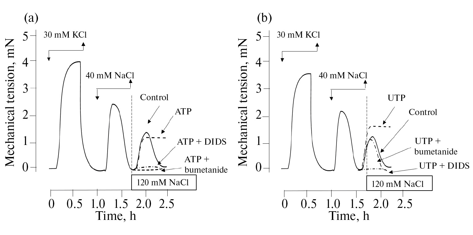 Эксперименты с блокаторами транспорта Cl– показали, что и DIDS – неселективный блокатор Cl--каналов и Cl-/HCO3--обменника, и ингибитор NKCC буметанид полностью подавляли развитие изоосмотической стрикции в присутствии АТФ. В то же время ингибитор NKCC буметанид в отсутствие АТФ увеличивал амплитуду изоосмотической стрикции кольцевых сегментов аорты крысы. На данный момент невозможно однозначно объяснить наблюдаемые изменения, особенно учитывая отличия в реакции изоосмотической стрикции на активацию пуринергических рецепторов в аорте и легочной артерии.