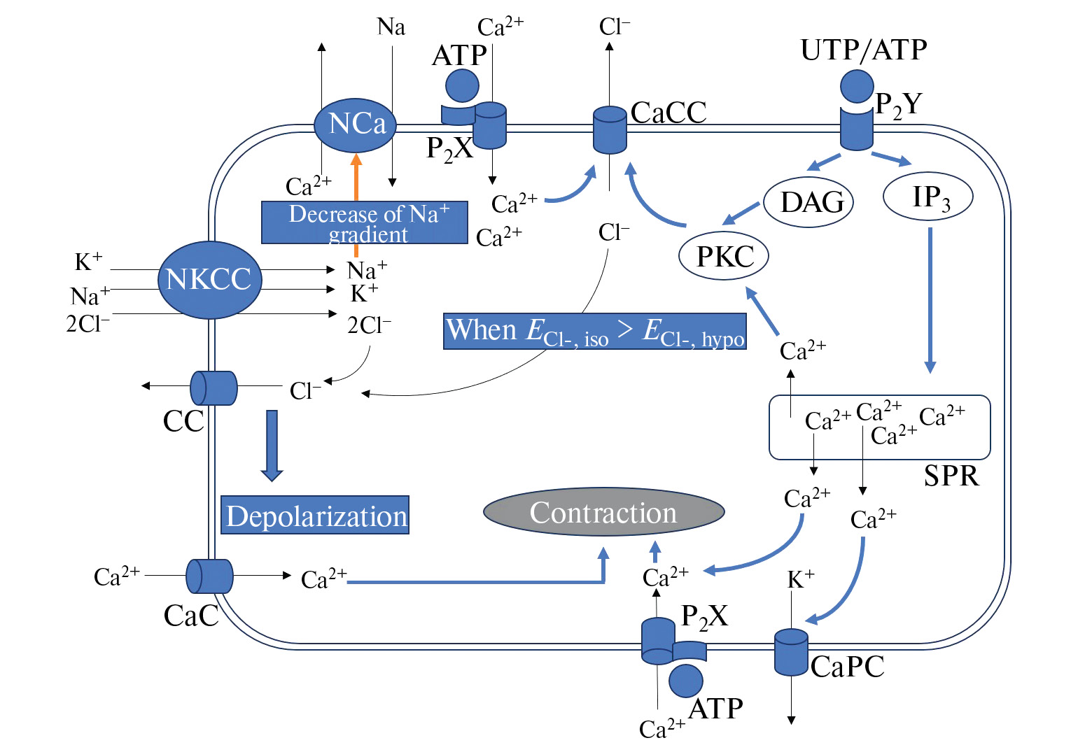 Рис. 4. Гипотетическая схема взаимодействия пуринергической сигнальной системы и механизмов регуляторного увеличения объема клеток при изоосмотической стрикции (пояснения в тексте). NKCC – Na+, K+, 2Cl--котранспорт, CC – хлорные каналы (без уточнения типа), СаСС – кальций-активируемые хлорные каналы, CaPC – кальций-активируемые калиевые каналы, СаС – потенциал-зависимые кальциевые каналы, NCa – Na+, Ca2+-обменник, ATP – аденозин-5’-трифосфат, UTP – уридин-5’-трифосфат, P2X – рецепторы, P2Y – рецепторы, SPR – саркоплазматический ретикулум, IP3 – инозитол-трифосфат, DAG – диацилглицерол, PKC – протеинкиназа С, ECl, hypo – равновесный потенциал Cl– при инкубации в гипоосмотической среде; ECl, iso – равновесный потенциал Cl– при возвращении в изоосмотическую среду. Синими стрелками показано активирующее влияние, красными – ингибирующее.