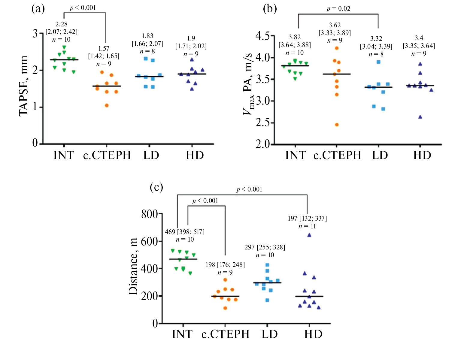 Рис. 3. Результаты неинвазивных тестов. (a – b) – результаты эхокардиографического исследования. (a) – систолическая экскурсия кольца трикуспидального клапана (ТAPSE). (b) – максимальная линейная скорость потока (Vmax) в легочном стволе (ЛС). (c) – пройденная дистанция по данным тредмил-теста. Int – группа здоровых животных, c.CTEPH – группа контрольной хронической тромбоэмболической легочной гипертензии, LD – низкая доза преднизолона, HD – высокая доза преднизолона.