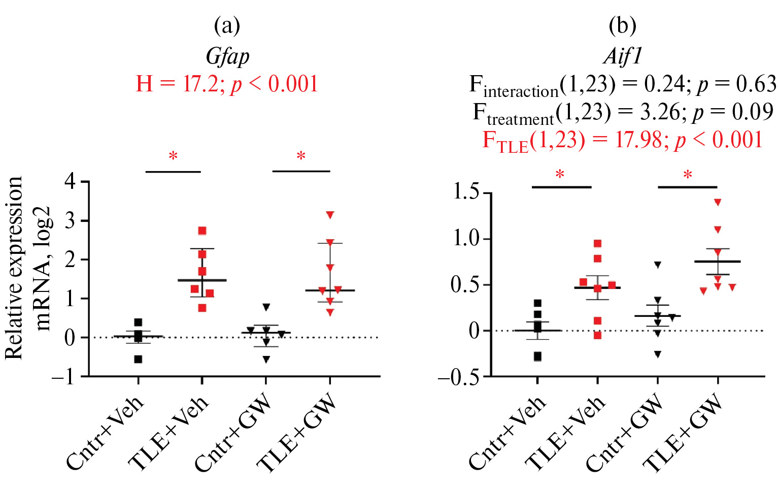 Поскольку эпилептогенез сопровождается астро- и микроглиозом, связанными с развитием спонтанных рецидивирующих судорог [57], мы оценили экспрессию генов маркеров активации астроцитов (Gfap) и микроглии (Aif1) у леченых и нелеченых TLE крыс. Показано, что экспрессия названных генов резко возрастает в процессе формирования TLE (p < 0.001). Кардарин не оказывал влияния на экспрессию этих генов (рис. 2), аналогичные изменения наблюдались как у леченых, так и нелеченых крыс.