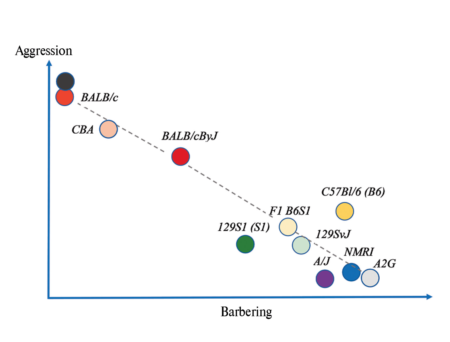 Актуальный вопрос, рекуррентно возникающий в научной литературе, касается роли агрессии в реализации барберинга. Так, анализ линейных различий в двух данных поведенческих доменах (рис. 3) указывает на четкую негативную корреляцию между агрессией и барберингом у мышей. Иными словами, барберинг, вероятно, выполняет социально буферную роль, позволяя колониям неагрессивных линий решать проблему построения социальной иерархии, не прибегая к дракам и укусам, как это делают высокоагрессивные линии [2, 4]. В то же время среди мышей с выраженным барберингом, как уже указывалось, зачастую существует обратная корреляция, поскольку ему оказываются подвержены менее агрессивные субординантные особи [1, 2]. Несмотря на видимое противоречие, имеется важное различие между сравнением генетически различных линий мышей в первом случае и индивидуальных различий генетически однородных мышей одной линии во втором. Вероятно, барберинг у мышей линии с высоким уровнем данного поведения активно используется для установления социальной иерархии в группе, однако не используется как социальный инструмент в группах мышей линий с низким уровнем барберинга. С другой стороны, возможное добровольное участие обриваемой мыши в процессе барберинга поднимает вопрос о биологической адаптивности барберинга для его реципиента, а также о возможном нейромедиаторном обеспечении данного поведения.