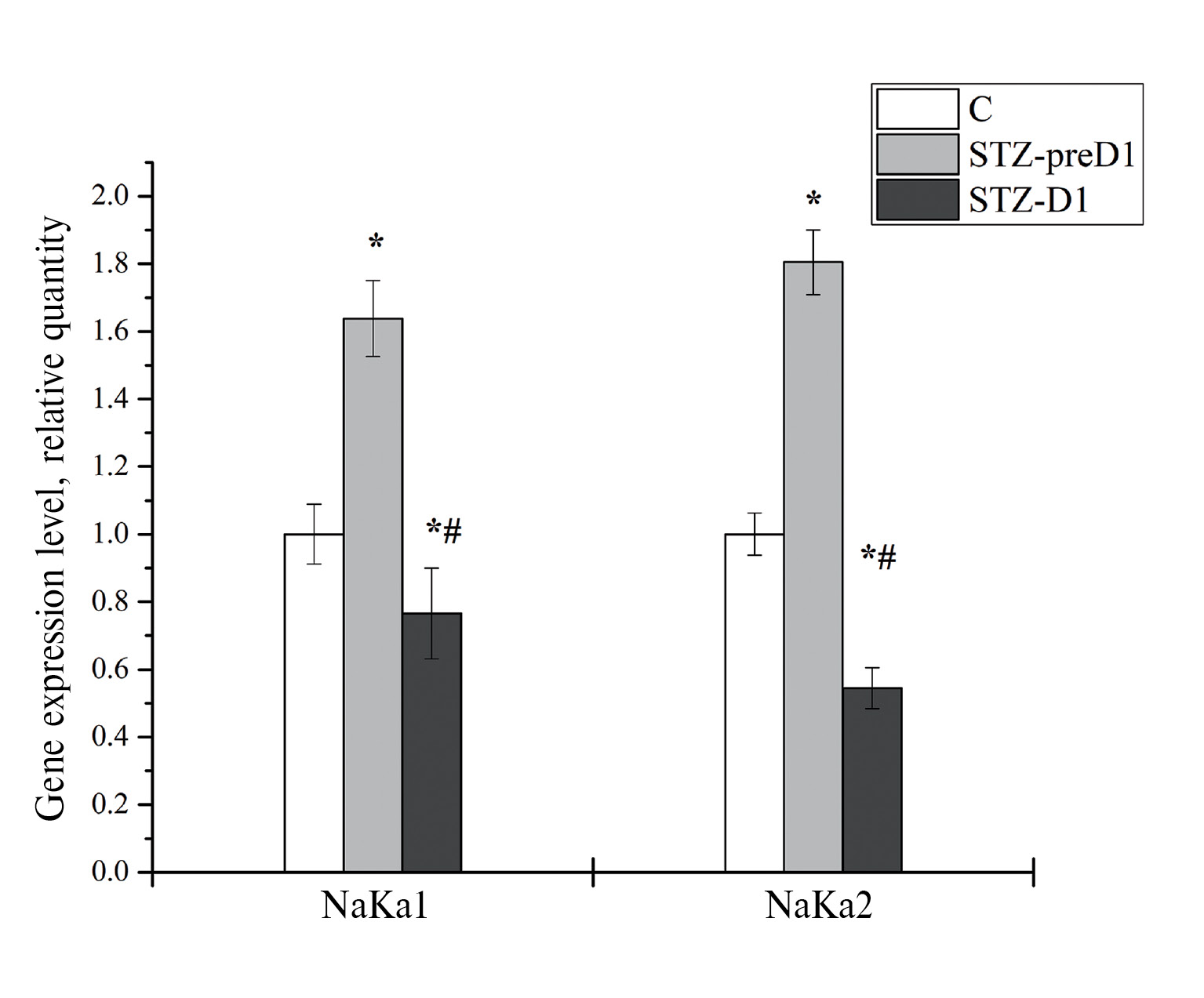 Уровень экспрессии генов Atp1a1 и Atp1a2, кодирующих α1- и α2-изоформы Na+/K+-АТФазы, возрастал в группе STZ-preD1 на 63.8 и 80.5% относительно группы С, и снижался в группе STZ-D1 на 23.4 и 45.5% (рис. 2).