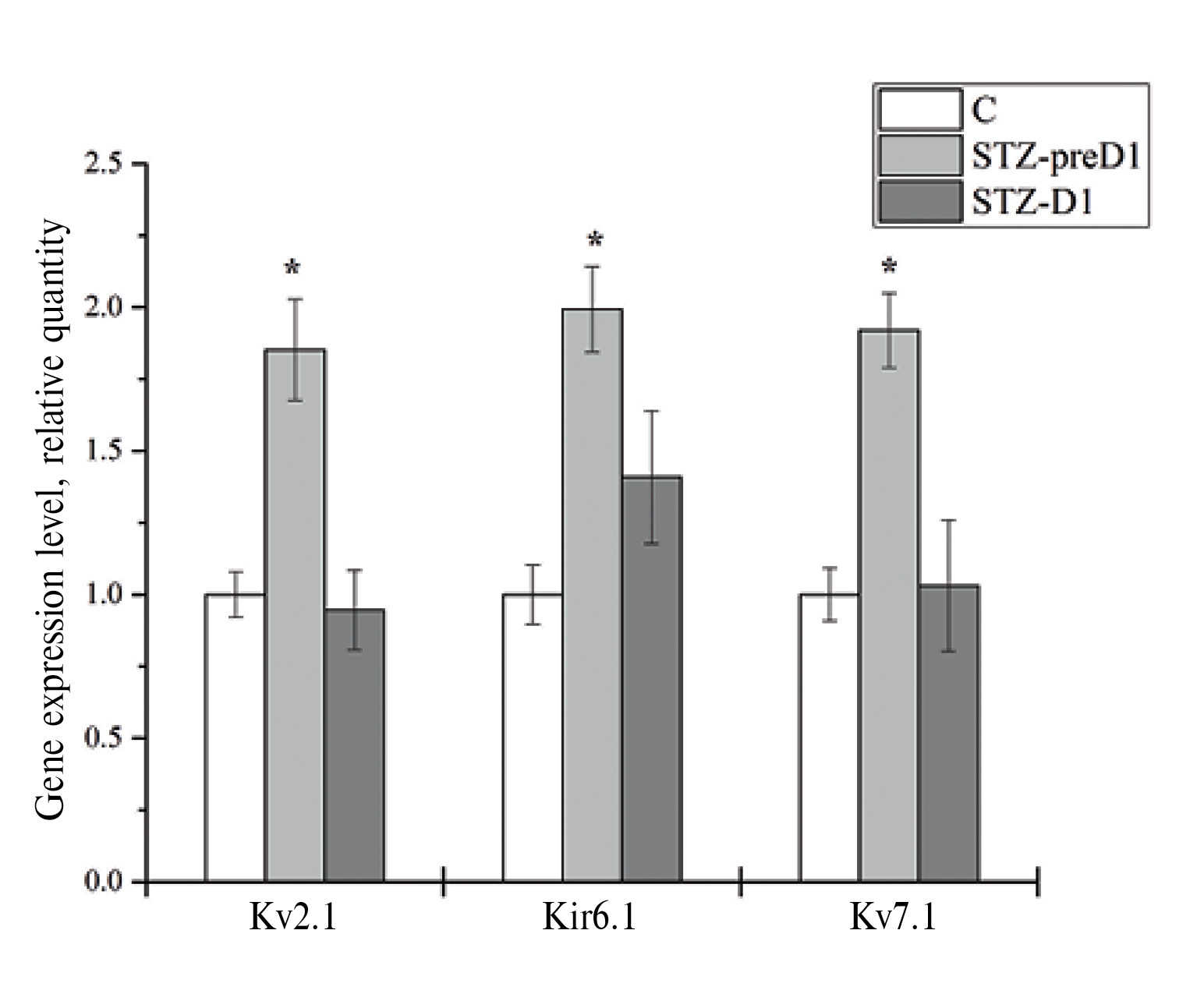 ПЦР анализ показал, что в группе STZ-preD1 по сравнению с группой С экспрессия транскриптов Kv2.1, Kir6.1 и Kv7.1 подтипов калиевых каналов возрастала на 85, 99 и 92% соответственно (рис. 4). В группе STZ-D1 транскрипции РНК изученных подтипов калиевых каналов не отличалась от таковой в группе С.
