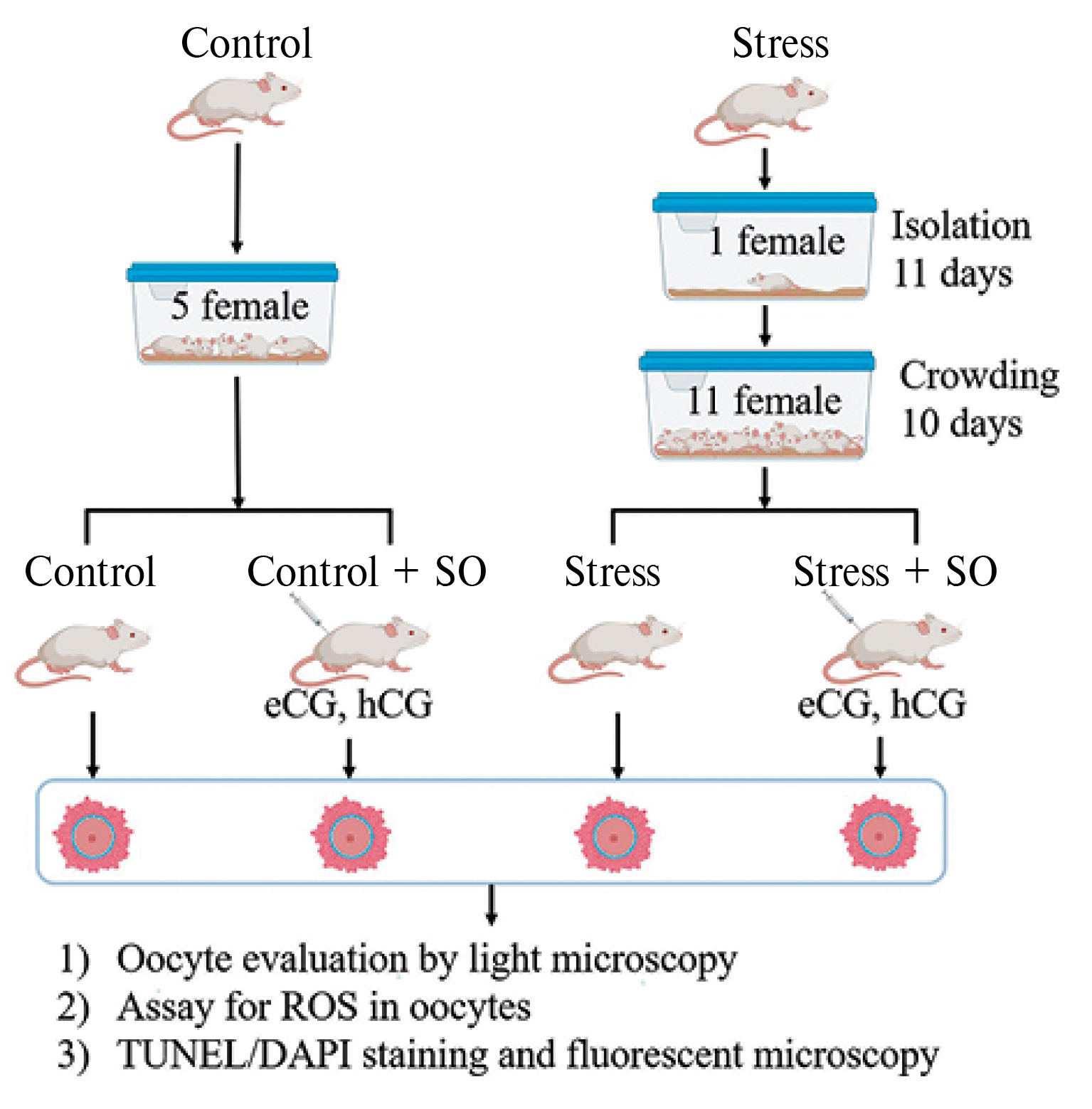 Рис. 1. Дизайн эксперимента. Группы: Control – интактные самки с естественным эстральным циклом; Control + SO – самки с индуцированной суперовуляцей; Stress – стрессированные самки с естественным эстральным циклом; Stress + SO – стрессированные самки с индуцированной суперовуляцей.