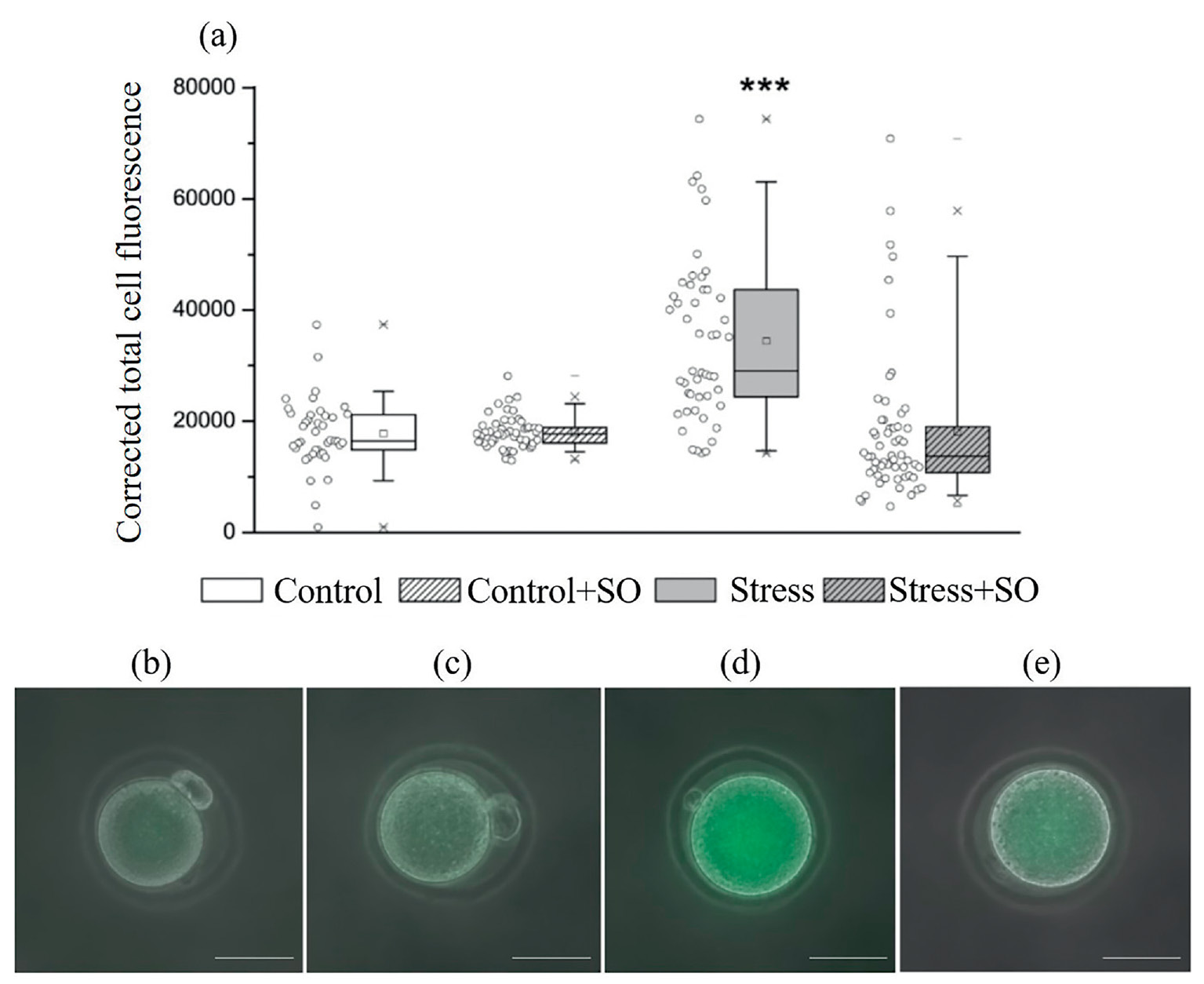 Рис. 3. Уровни накопления активных форм кислорода в цитоплазме ооцитов у интактных и стрессированных самок. (а) – интенсивность флуоресценции; (b - d) – репрезентативные изображения ооцитов, окрашенных 2’,7’-дихлордигидрофлуоресцеин-диацетатом: (b) – Контроль, (c) – Контроль + СО, (d) - Стресс, (e) – Стресс + СО. Шкала = 50 мкм. Данные представлены как медиана и 25 - 75% квартили. *** p < 0.001 по сравнению с группой Контроль (Control).