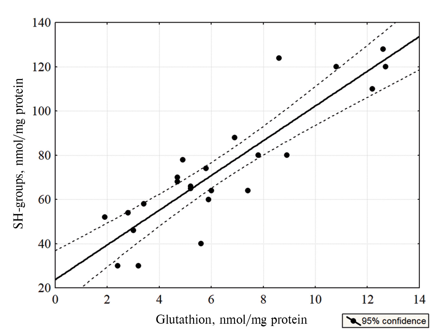 Предварительный курс ДГК нивелирует отрицательные эффекты гипотермии на содержание тиоловых групп. Уровень их повышается относительно гипотермии на 69.2%, однако остается ниже контрольных значений на 12%. Корреляционный анализ по Спирману показал, что между глутатионом и тиоловыми группами белков имеется высокая степень положительной корреляции (рис. 1) (r = 0.88, p < 0.05). Известно, что GSH поддерживает все тиоловые группы протеома в клетке, участвуя совместно с глутаредоксином (Grx) в реакциях тиол-дисульфидного обмена [14].