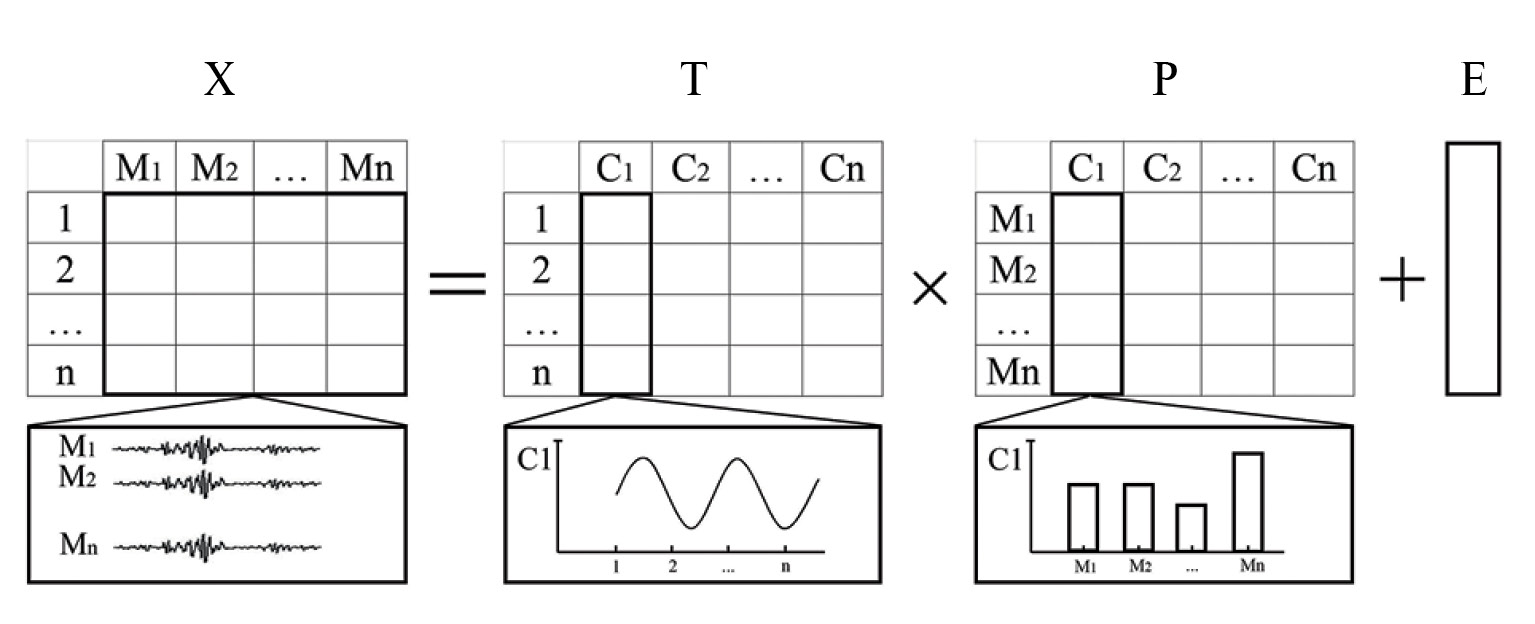 Рис. 1. Схема разложения матрицы данных на компоненты и выделения пространственно-временной структуры синергий.