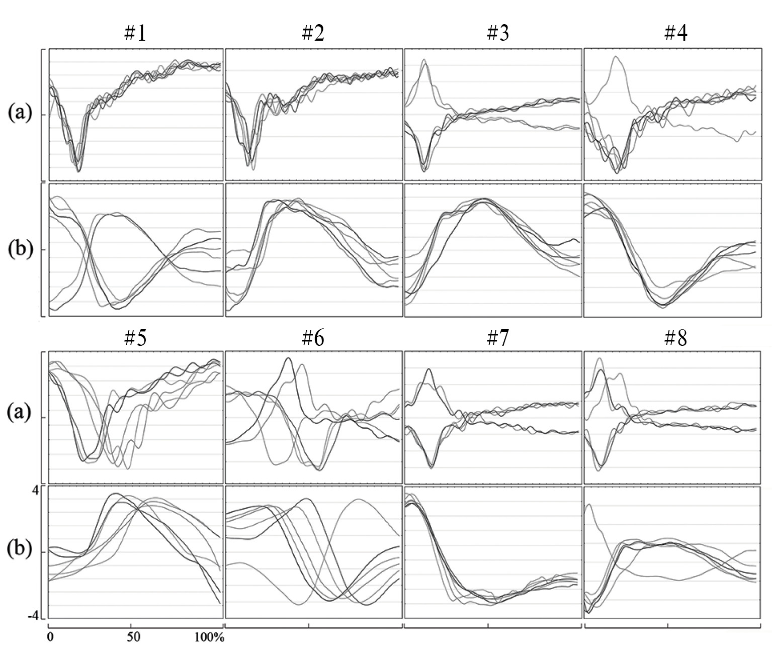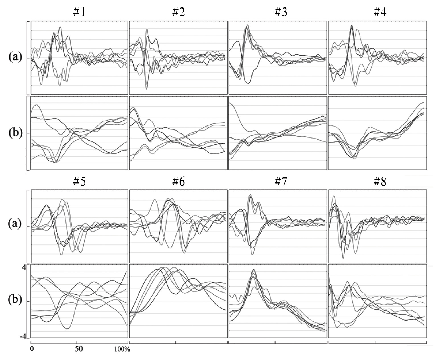 Рис. 2. Усредненные внутрииндивидуальные профили активации первой мышечной синергии (а) и кинематического модуля (b) при выполнении упражнений. 1 – бросок вперед правой рукой, 2 – бросок вперед левой рукой, 3 – бросок вперед двумя руками, 4 – бросок правой рукой в сторону, 5 – бросок правой рукой назад, 6 – бросок из-за спины вперед правой рукой, 7 – бросок стоя на коленях вперед правой рукой, 8 – бросок из седа вперед правой рукой. По оси абсцисс – у. е., по оси ординат – прогресс движения.