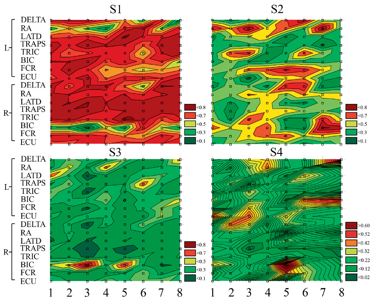 Рис. 4. Весовые коэффициенты в структуре мышечных синергий при реализации разных бросков мяча. L – левая сторона, R – правая сторона. 1 – бросок вперед правой рукой, 2 – бросок вперед левой рукой, 3 – бросок вперед двумя руками, 4 – бросок правой рукой в сторону, 5 – бросок правой рукой назад, 6 – бросок из-за спины вперед правой рукой, 7 – бросок стоя на коленях вперед правой рукой, 8 – бросок из седа вперед правой рукой. S1-S4 – номер мышечной синергии.