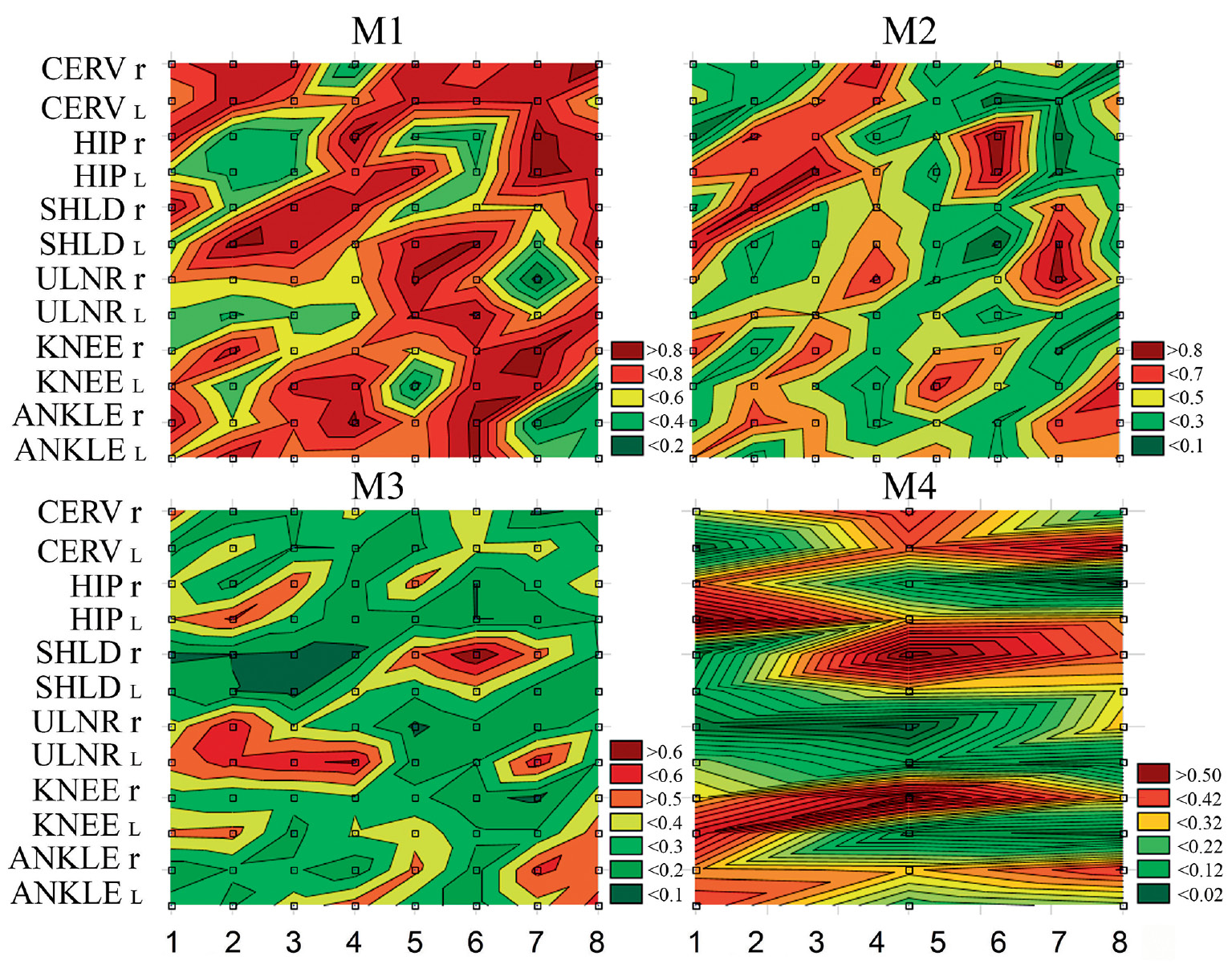 Для регистрации перемещений и величин суставных углов применяли систему Qualisys (Швеция) с частотой оцифровки 500 Гц. Светоотражающие маркеры прикрепляли к основным антропометрическим точкам сегментов тела, соответствующим осям вращения в суставах. Регистрировали динамику величин следующих суставных углов обеих сторон тела: шейного (CERV), плечевого (SHLD), локтевого (ULNR), тазобедренного (HIP), коленного (KNEE) и голеностопного (ANKLE). К этим данным применяли процедуру аппроксимизации кривой 2-й степени.