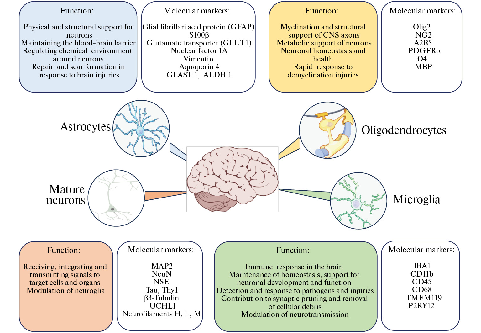 Помимо нейронов, центральная нервная система (ЦНС) содержит глию (нейроглию) – гетерогенную группу клеток, выполняющую важные функции поддержания гомеостаза мозга [1]. Нейроглия включает в себя радиальную глию, астроциты, олигодендроциты и их предшественники, а также микроглию и составляет около половины всех клеток мозга [1]. Доля глиальных и нейрональных клеток варьирует в зависимости от региона мозга. В среднем у человека количество нейронов и общее количество клеток глии приблизительно равны. Из них порядка 20% приходится на долю астроцитов, 25% олигодендроцитов и 5–15% микроглии [1]. Глиальные клетки являются важной частью нормального функционирования ЦНС [2], включая регуляцию ионов и нейротрансмиттеров, метаболизм нейронов, синапто- и нейрогенез, синаптическую коммуникацию, нейроиммуномодуляцию и поддержание гематоэнцефалического барьера (ГЭБ) [1]. Дисфункции нейроглии играют важную роль в патогенезе различных нейродегенеративных заболеваний, в том числе болезней Альцгеймера и Паркинсона, деменции, энцефалопатий и других [3]. Поэтому изучение функциональных изменений ЦНС невозможно без понимания участия нейроглии и выполняемых ею функций.