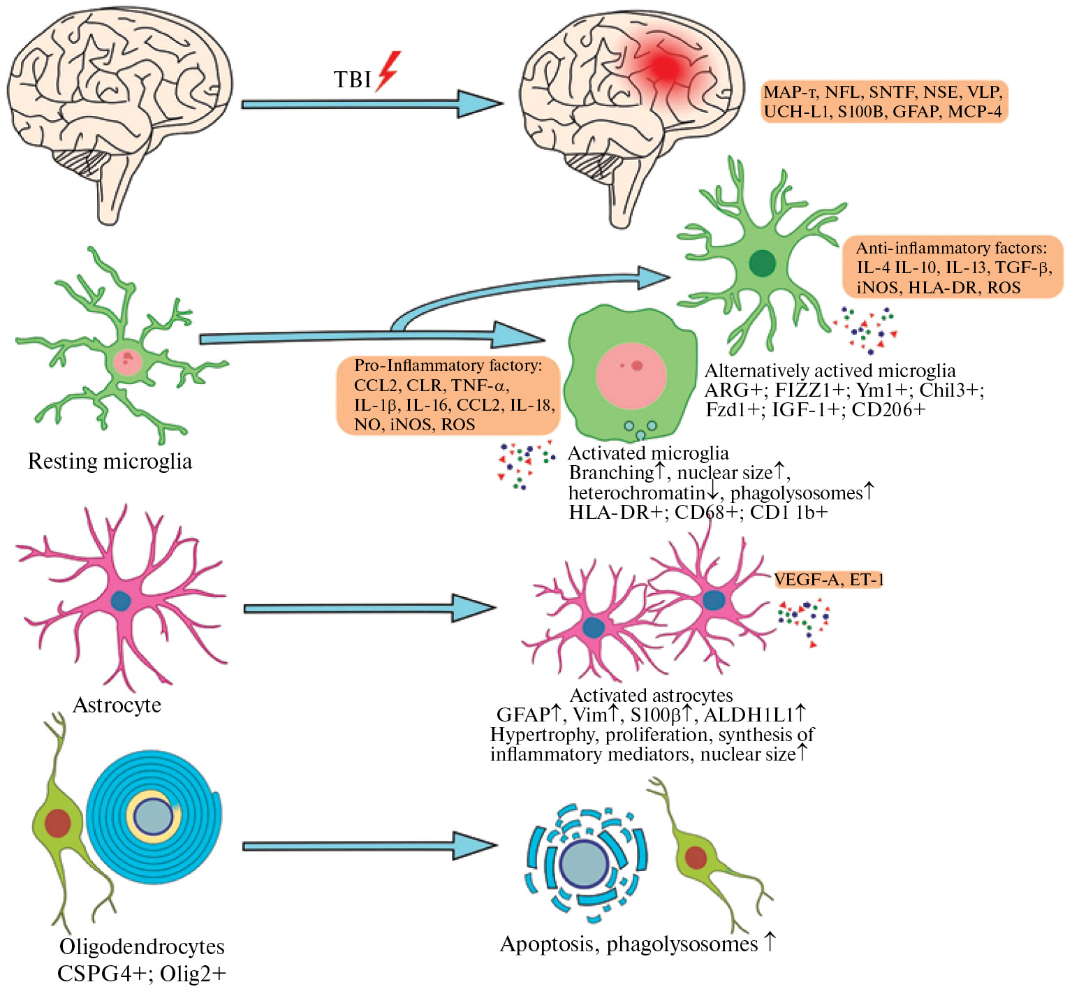 Рис. 2. Изменение функциональной активности глиальных клеток при черепно-мозговой травме.