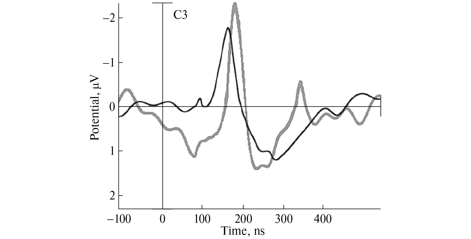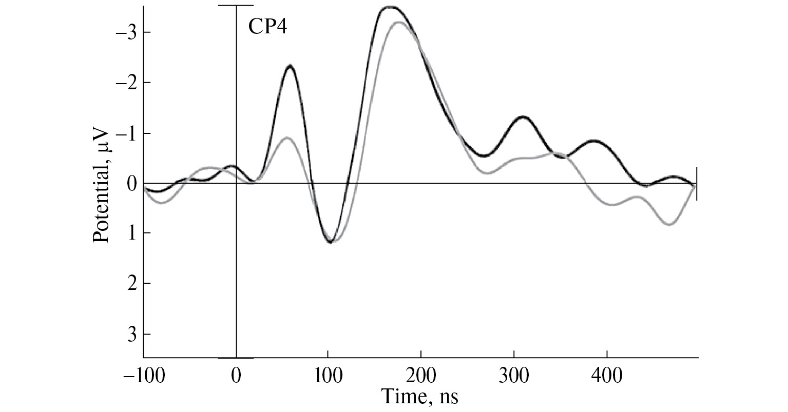 Рис. 2. Активация коры на эмоционально-значимый раздражитель по сравнению с нейтральным у здоровых испытуемых в правой центрально-теменной области. ВП на нейтральный стимул обозначен серой линией, ВП на эмоционально-значимый стимул – черной линией.