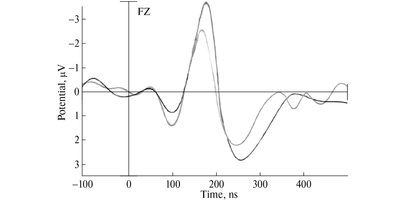 Рис. 3. ПЭ с одновременным увеличением латентности и амплитуды волны N170 в центральной лобной области по средней линии у больных шизофренией. ВП на нейтральный стимул обозначен серой линией, ВП на эмоционально-значимый стимул – черной линией.