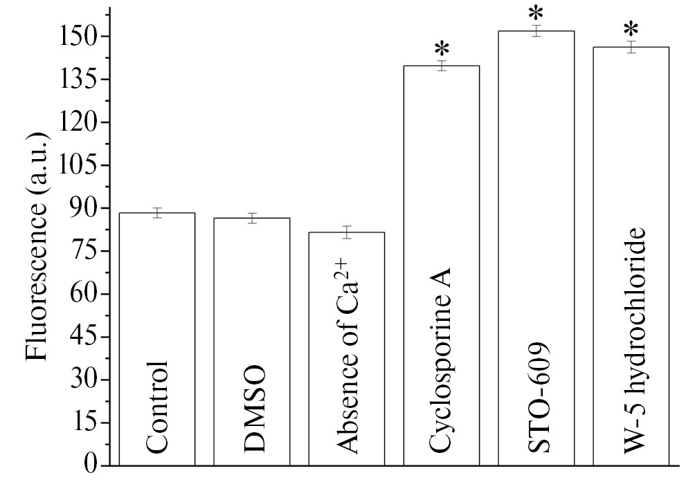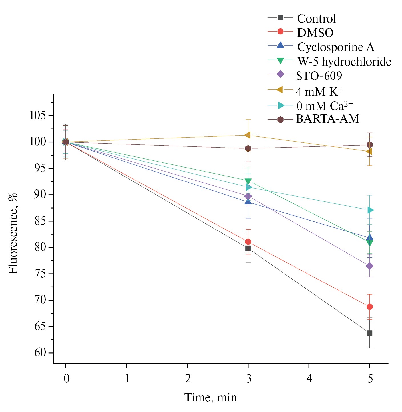 Для ингибирования Са2+-акцепторных белков использовали следующие реактивы: циклоспорин А (Sigma-Aldrich, США), STO-609 (Sigma-Aldrich) и W-5 гидрохлорид (Sigma-Aldrich). Поскольку данные вещества плохо растворимы в воде, мы делали промежуточный раствор, содержащий органический растворитель диметилсульфоксид (DMSO, Sigma-Aldrich), в котором растворяли вещества. Далее из промежуточного раствора вещества добавлялись в нужной концентрации в физиологический раствор. Для оценки влияния DMSO на изучаемые процессы проводили контрольные эксперименты в присутствии и в отсутствие DMSO.