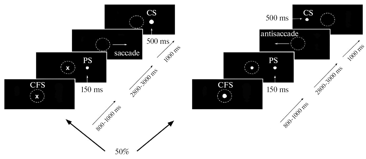 Каждому участнику в неопределенном порядке с вероятностью 50% предъявляли в центре экрана один из двух типов фиксационных стимулов (ЦФС) в виде крестика или кружка, сигнализирующих о характере будущего ответа: движение глаз на запомненный стимул (саккада) или в противоположную (симметричную) точку пространства (антисаккада). Применяли метод контрбалансировки: у половины участников сигналом совершать саккаду был кружок, а в противоположную сторону (антисаккаду) – крестик. У второй половины участников, наоборот, крестик был сигналом совершить саккаду, а кружок – антисаккаду. Интервал между последующими реализациями стимулов составлял 2–3 с.