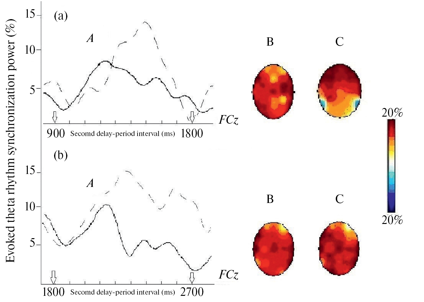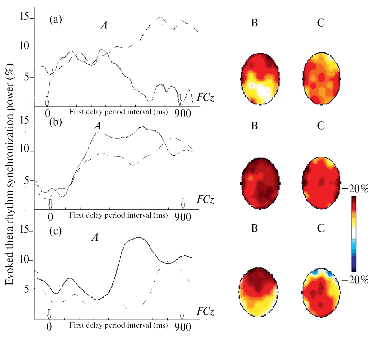 В каждом из интервалов периода задержки нами были выявлены межгрупповые различия в выраженности вызванной тета-синхронизации, которые могут отражать различные уровни активации нейронных сетей, участвующих в реализации функций рабочей памяти и внимания.