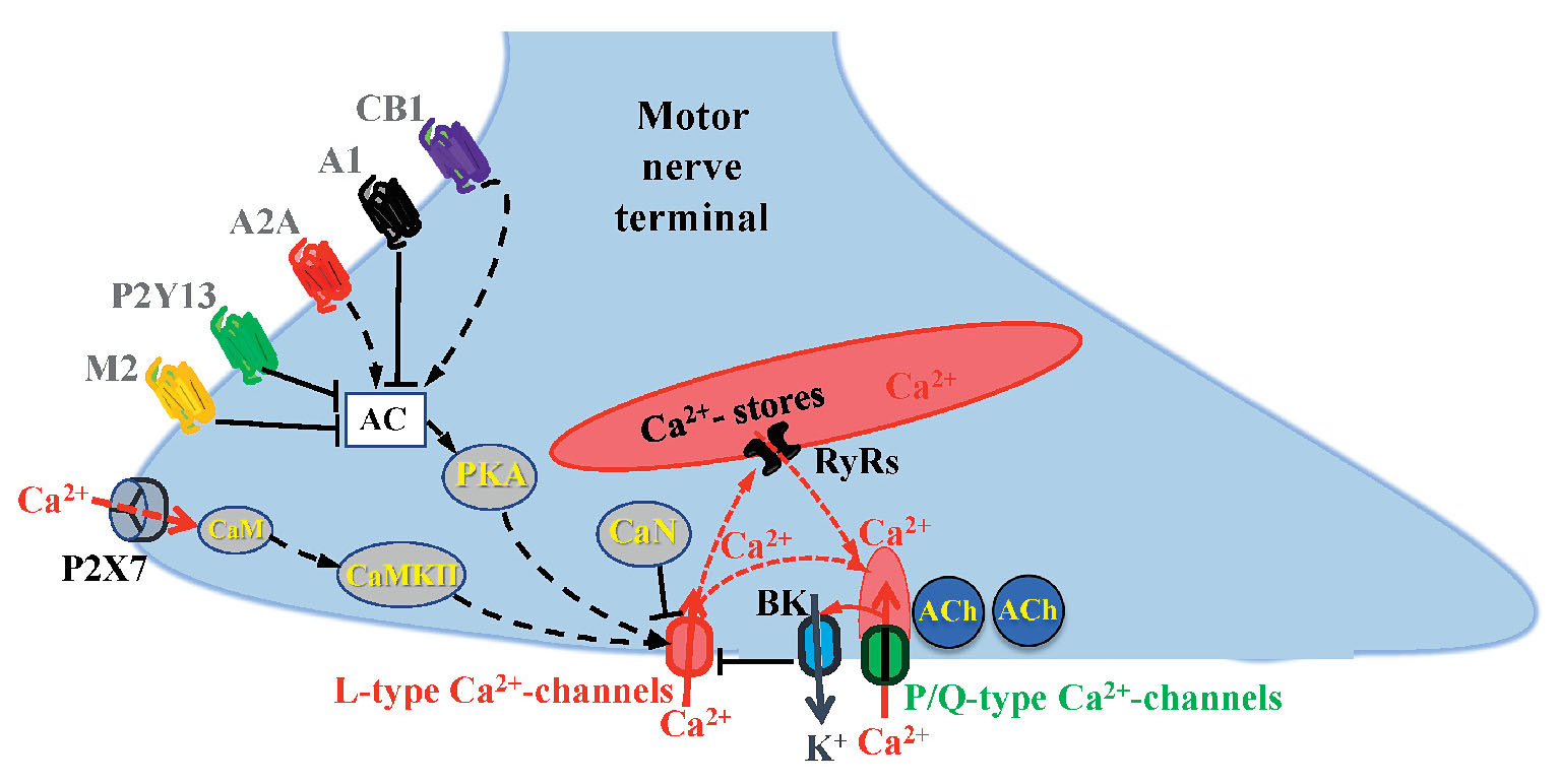 Gβγ-опосредованное ингибирование CaV2 является потенциал-зависимым, поскольку его влияние на работу Сa2+-каналов может быть значительно снижено при сильной и/или повторяющейся деполяризации мембраны, что вызывает уход Gβγ-субъединиц от СaV [85]. В НМС млекопитающих такой способ регуляции активности триггерных Сa2+-каналов P/Q-типа принципиально может функционировать в случае активации и запуска сигнальных путей со стороны пресинаптических метаботропных Gi-белок-сцепленных аденозиновых А1- и А3-рецепторов [87, 88], пуриновых P2Y13-рецепторов [89, 90] и мускариновых M2-рецепторов [91].