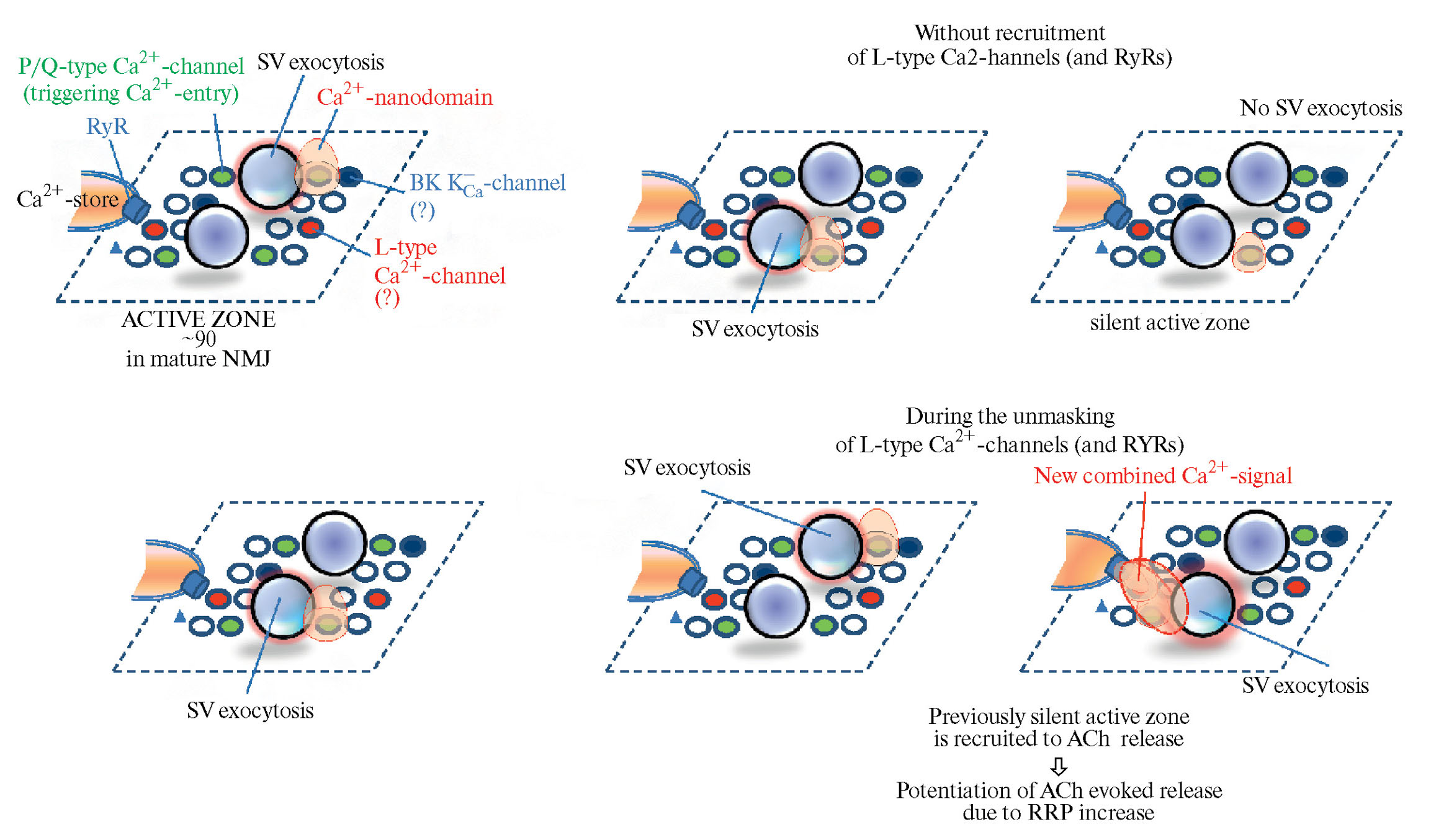 Биномиальный анализ секреции АХ в НМС мыши показал, что вероятность выброса квантов АХ достаточно высока (около 0.9), однако число мест секреции оказалось довольно низким (около 70) [113]. Это резко противоречит вышеприведенным данным о количестве активных зон в моторной нервной терминали и числе синаптических везикул, потенциально готовых к выбросу в них, если не допускать, что значительное большинство активных зон в составе НМС «молчит», и лишь небольшое их количество (меньше 10–20%) принимает участие в вызванной приходом пресинаптического ПД быстрой квантовой секреции АХ. Такая гетерогенность вероятности выброса АХ между активными зонами может быть связана с разной чувствительностью машинерии экзоцитоза синаптических везикул к ионам Сa2+ в отдельных активных зонах, что, возможно, определяется разным положением Сa2+-входов (Сa2+-каналов P/Q-типа) по отношению к везикулам [114].