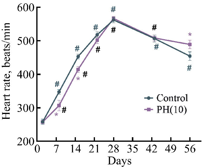 Рис. 1. Влияния пренатальной гипоксии периода раннего органогенеза на возрастную динамику ЧСС. Данные представлены в виде среднего и стандартной ошибки среднего. Значения ЧСС на 2–28-й ПНД получены в работе [25]. Условные обозначения: PH(10) – острая пренатальная гипоксия на 10-е сутки гестации. * – значимые (p < 0.05) различия между экспериментальными группами. #, # – значимые (p < 0.05) различия между разными возрастными периодами соответствующих экспериментальных групп.