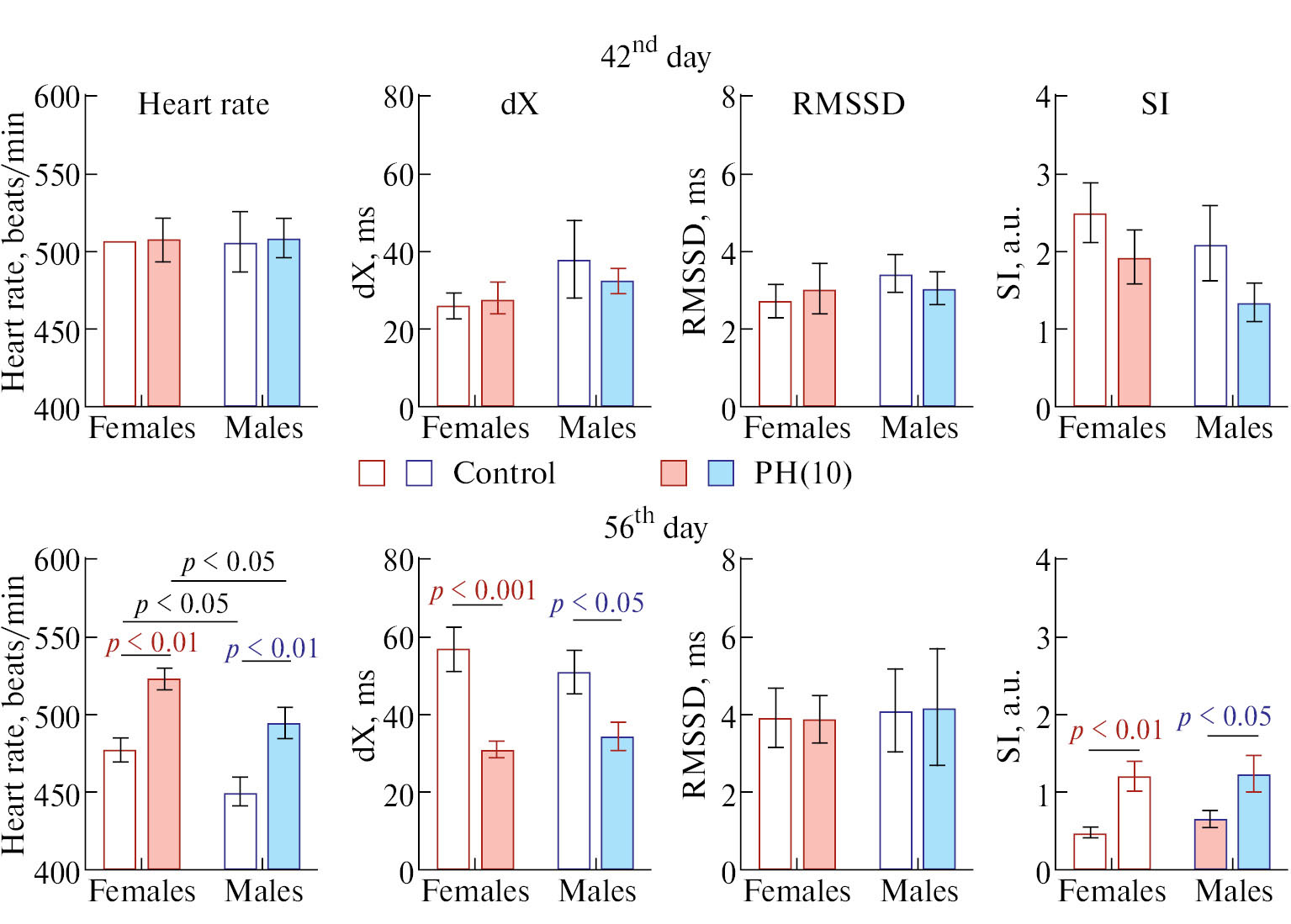 Для оценки работы сердца в обеих экспериментальных группах на 42-й и 56-й дни постнатального периода (ПНД) проводили неинвазивную регистрацию ЭКГ в свободном поведении в течение трех минут. Настоящее исследование является продолжением изучения последствий воздействия пренатальной гипоксии на регуляцию сердечного ритма у крыс на разных этапах постнатального онтогенеза и охватывает очень важный временной отрезок, оканчивающийся наступлением половой зрелости животных. Характерными особенностями выбранного временного отрезка у крыс могут быть некоторая гетерохрония морфологического и функционального созревания отдельных звеньев вегетативной нервной системы, а также гормональный дисбаланс. Отдельно следует отметить, что данный возрастной период характеризуется множеством изменений в нейроэндокринной функции, что может приводить как к немедленным, так и к долгосрочным влияниям на физиологию и поведение [18].