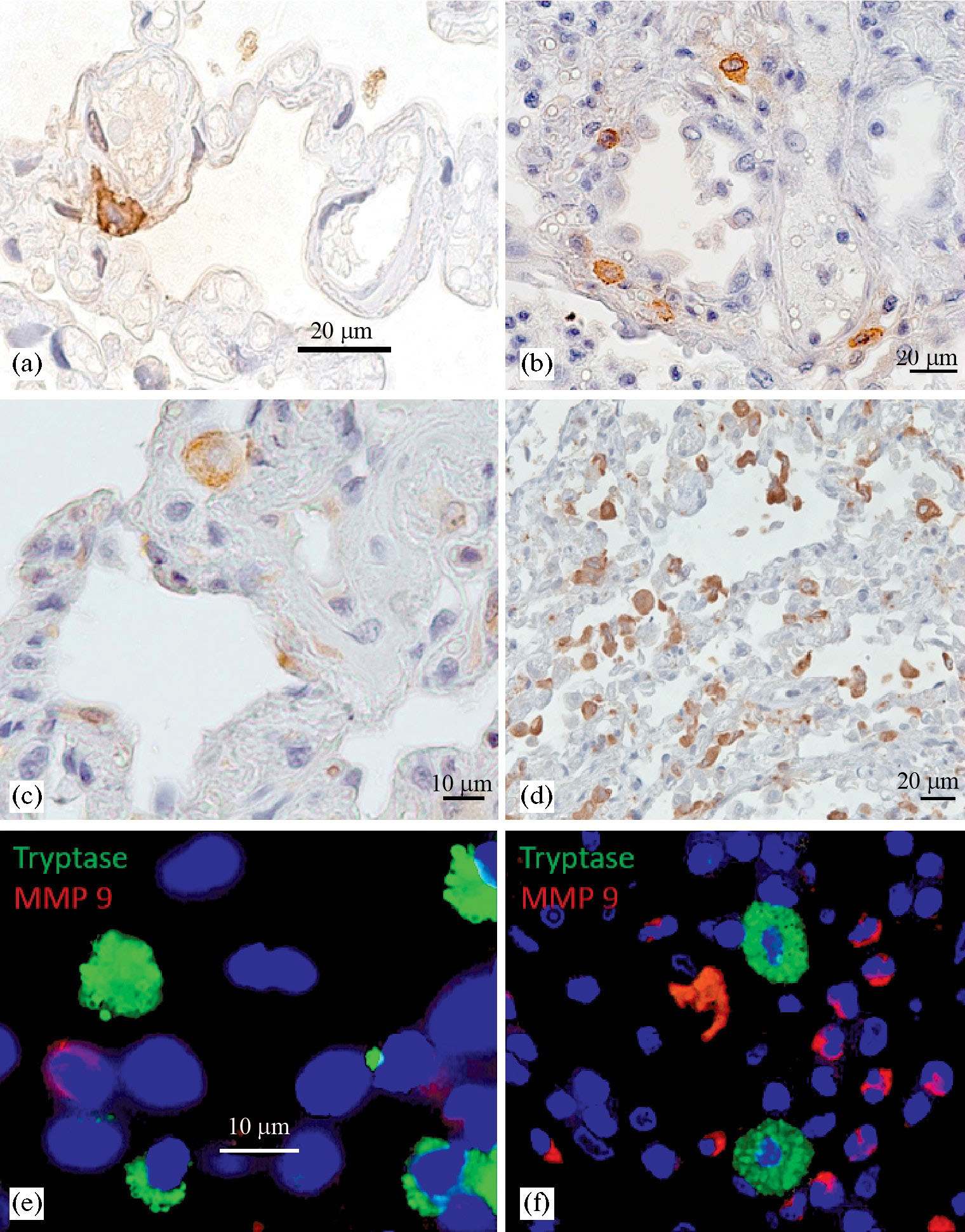 Рис. 4. Гистотопография и характер экспрессии триптазы тучных клеток (a, b), TGF-β (c, d) и ММП-9 (e, f) в легких при развитии ЛГ (b, d, f) и при ЛГ с ингаляцией 4% H2 (a, c, e). Специфическое для иммуногистохимической реакции коричневое окрашивание выявляет скопление триптаза-позитивных тучных клеток с признаками дегрануляции в интерстиции легочной ткани (b), в то время как под влиянием ингаляции 4% H2 снижается экспрессия данной протеазы (a); инфильтрация иммунопозитивными клетками с высокой экспрессией TGF-β в группе МКТ-Контроль (d) в сравнении с немногочисленными TGF-β позитивными клетками в группе применения молекулярного водорода (c); низкая экспрессия ММП–9 (красный цвет, метка-Cy3) на фоне солоколизации с триптаза-позитивными тучными клетками (зеленый цвет, метка Alexa Fluor 488) в группе (e) и скопление ММП-9 позитивных клеток, преимущественно нейтрофилов (в соответствии с морфологией клеток) в присутствии триптаза-позитивных тучных клеток. Методы окрашивания: (a, b, c, d) – иммуногистохимическая реакция, (e, f) – иммунофлуоресцентное окрашивание. Увеличение (a, b, d) – х 400; (c, e, f) – х 1000.