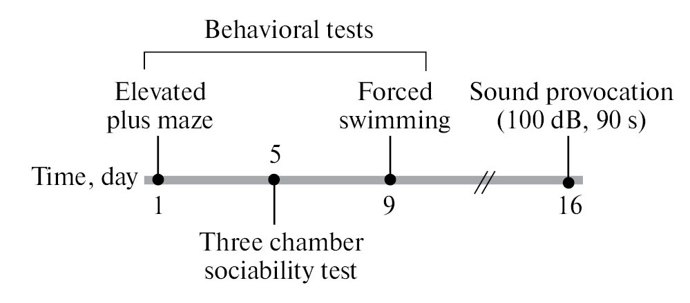 Поведение животных (WAG/Rij, n = 20, Wistar, n = 13) исследовали при помощи следующих тестов: «Приподнятый крестообразный лабиринт» (ПКЛ), «Вынужденное плавание» (ВП), социальное поведение оценивали в тесте «Трехкамерный социальный лабиринт» (ТСЛ). Тесты проводились в разные дни с интервалом не менее 3 дней и были упорядочены по возрастанию стрессогенности (ПКЛ – ТСЛ – ВП). Тестирование крыс на предрасположенность к аудиогенной эпилепсии проводили после завершения всех поведенческих тестов (рис. 1), чтобы исключить предварительное влияние звуковых стимуляций.