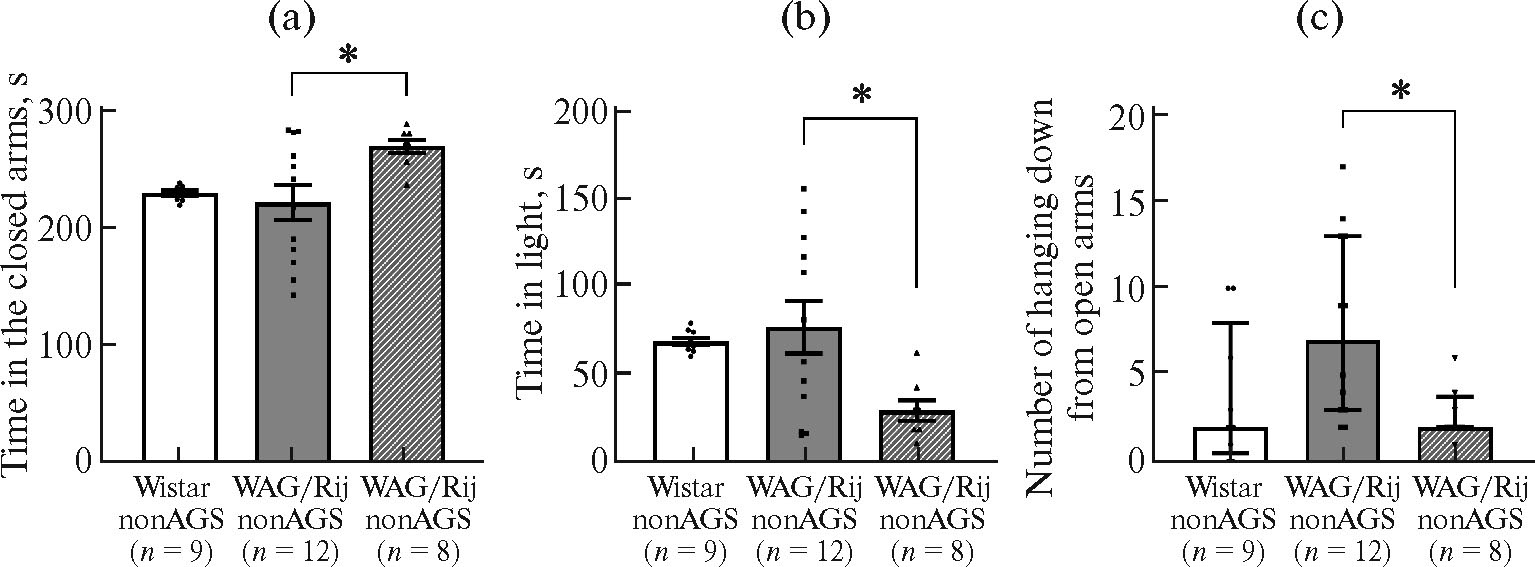 Рис. 3. Тест «Приподнятый крестообразный лабиринт». Сравнение групп «Wistar-nonAGS», «WAG/Rij-nonAGS» и «WAG/Rij-AGS». (a) – время в закрытых рукавах, * p < 0.05, One-way ANOVA с поправкой Тьюки на множественное сравнение, данные представлены в виде M ± SEM; (b) – время на свету, * p < 0.05, One-way ANOVA с поправкой Тьюки на множественное сравнение, M ± SEM; (c) – количество свешиваний с открытых рукавов, *p < 0.05, критерий Крускала – Уоллиса с использованием теста Данна для множественного сравнения, Me ± IQR.