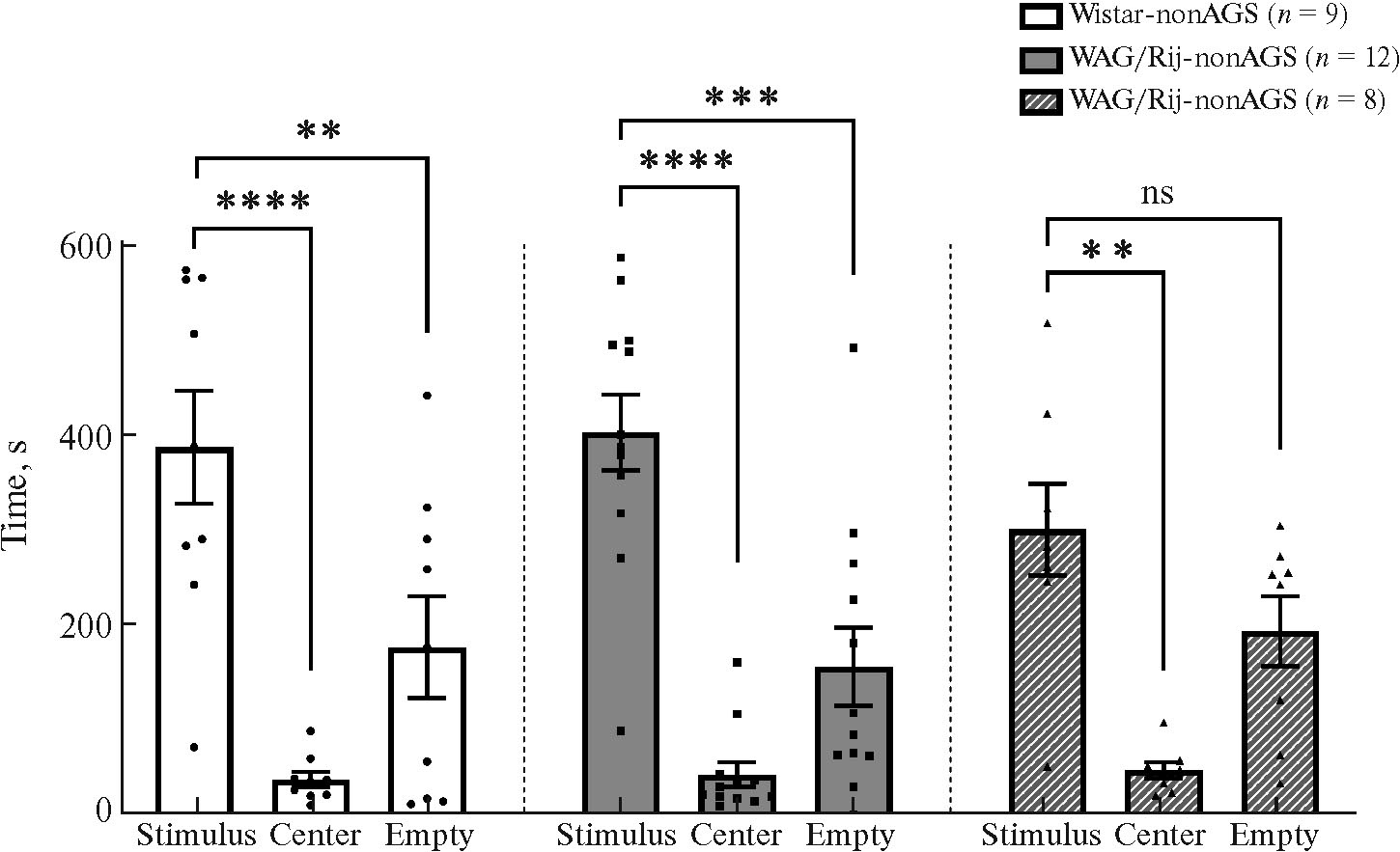 При сравнении времени, проведенного в каждом отсеке, между группами статистически значимых отличий не обнаружили. По количеству контактов, количеству стоек и актов груминга группы Wistar-nonAGS, WAG/Rij-nonAGS и WAG/Rij-AGS не отличались. Во время второй посадки (оценка стремления к социальной новизне) различий между исследованными группами не обнаружили.