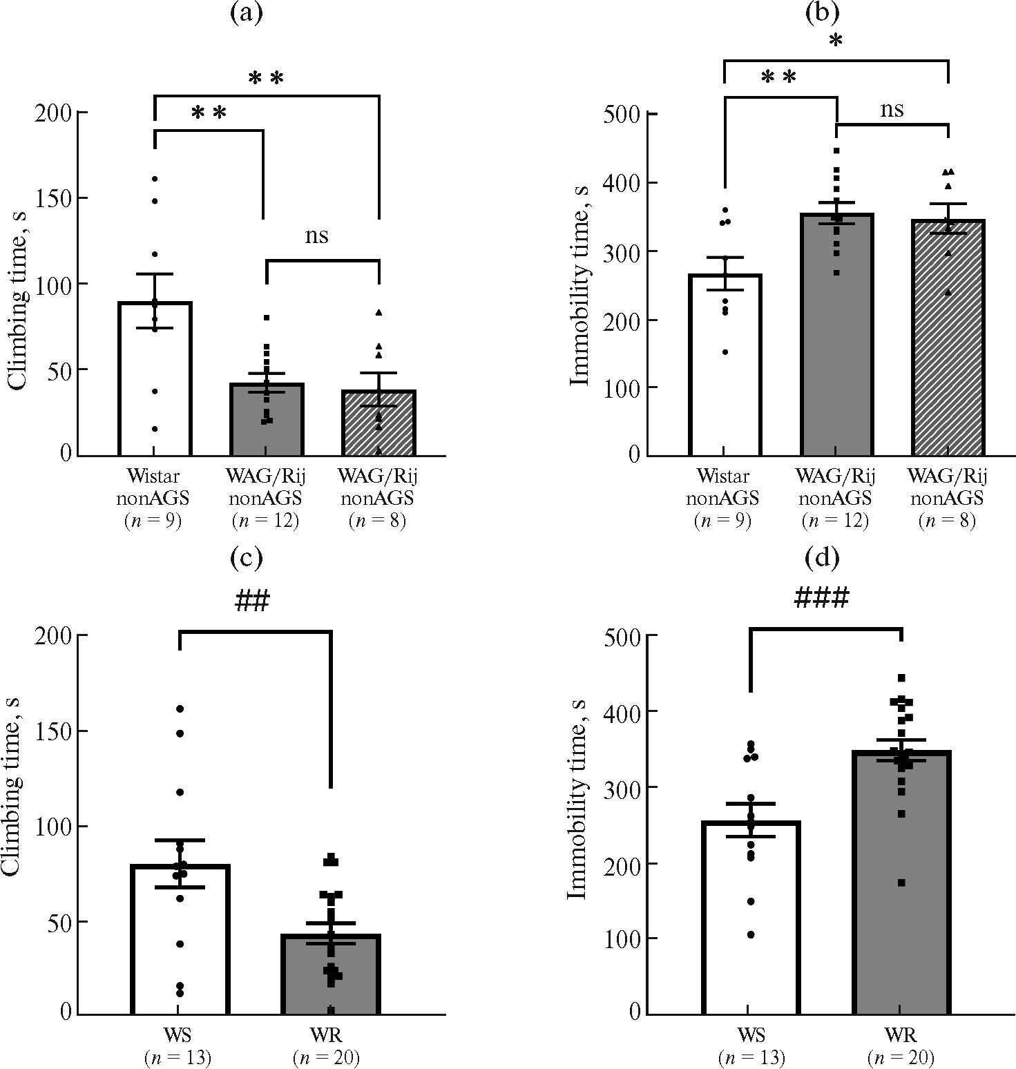 Рис. 5. Тест «Вынужденное плавание». Сравнение времени активного плавания (a) и времени неподвижности (b) у крыс Wistar-nonAGS, WAG/Rij-nonAGS и WAG/Rij-AGS. * – достоверные отличия от Wistar-nonAGS (One-way ANOVA c поправкой Тьюки), значимых отличий между крысами WAG/Rij-nonAGS и WAG/Rij-AGS не обнаружили. Сравнение времени активного плавания (c) и времени неподвижности (d) у крыс Wistar (WS) и WAG/Rij (WR). # – достоверные отличия, непарный t-критерий. Данные представлены в виде среднего значения и стандартной ошибки среднего.