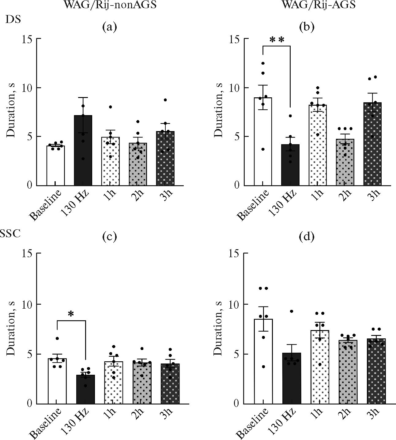 Рис. 6. Средняя продолжительность разрядов до (baseline), во время (130 Hz) и после (1/2/3h) высокочастотной стимуляции дорсального стриатума (a, b) и соматосенсорной коры (c, d) у неаудиогенной и у аудиогенной группы крыс линии WAG/Rij. *p < 0.05, **p < 0.01 (DS – однофакторный дисперсионный анализ ANOVA, тест Холма – Сидака; SSC – критерий Фридмана). Данные представлены в виде среднего значения и стандартной ошибки среднего.