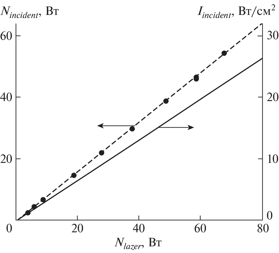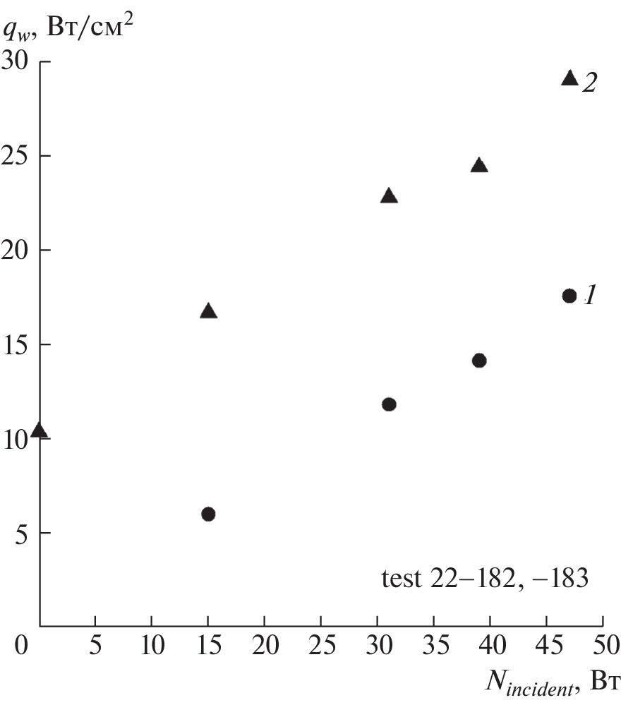 The heat transfer to a cylindrical water-cooled copper model was experimentally investigated in an induction VGU-4 high-frequency (HF) plasmatron of the Institute for Problems in Mechanics of the Russian Academy of Sciences. The model, 30 mm in diameter, equipped with a calorimetric transducer with a heat-adsorbing graphite surface, 13.8 mm in diameter, was exposed to the surface heating in the combined regime by nitrogen plasma and laser radiation and in the cases of the heating with only laser radiation or a nitrogen plasma jet. The experiments in the HF-plasmatron jets were performed at the pressure in the setup low-pressure chamber p = 1 × 104 Pa, nitrogen mass flow rate G = 2.4 g/s, and the plasmatron HF-generator anode power Na.p. = 22 kW. It is established that in the chosen experimental regimes the dissociated-nitrogen jet and the high-frequency induction discharge do not produce a considerable effect on the laser beam passing through them. The values of the heat flux density are obtained as functions of the laser radiation power delivered. The subsonic nitrogen plasma flow in the quartz discharge channel and in the low-pressure chamber of the VGU-4 setup is numerically modeled under the experimental conditions basing on the solution of the complete Navier–Stokes equations using the Patankar–Spalding method.