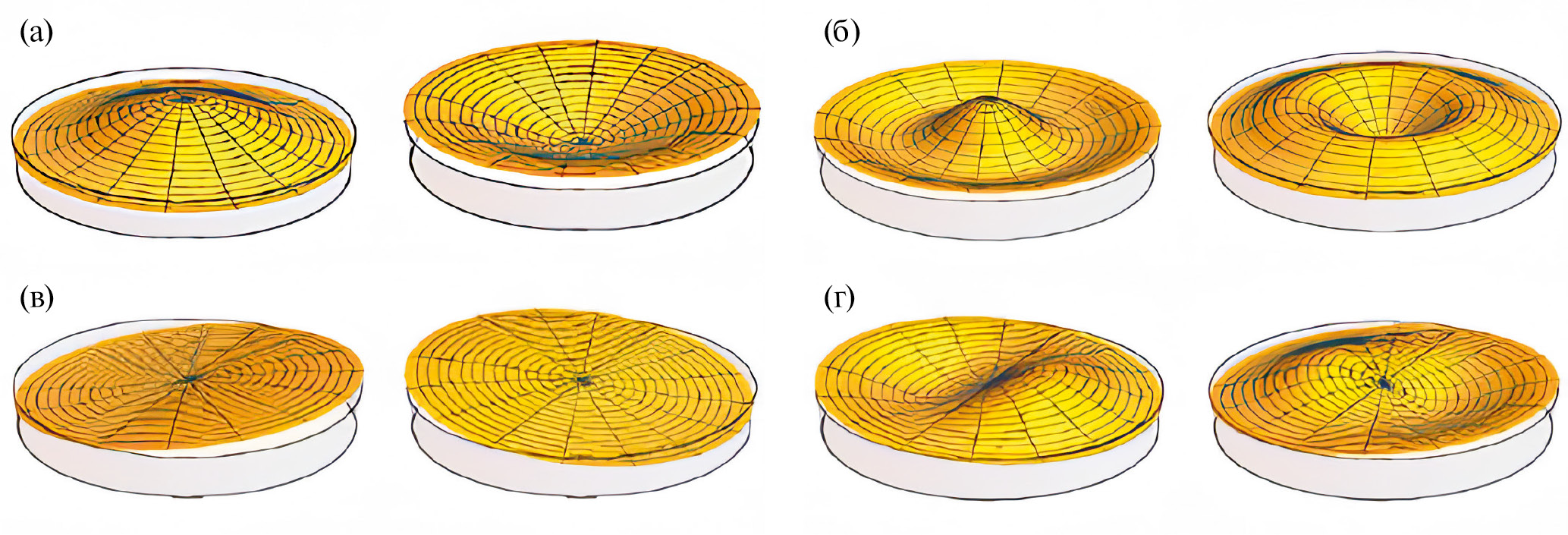 2. Рис. 1. Профили волн максимального развития для осесимметричных и асимметричных мод при t = 0, p/w (Anm = 3 см, Bnm = 0; R0 = 9.8 см; h = 4 см): (а–г) — (0, 1), (0, 2), (1, 1) и (1, 2).