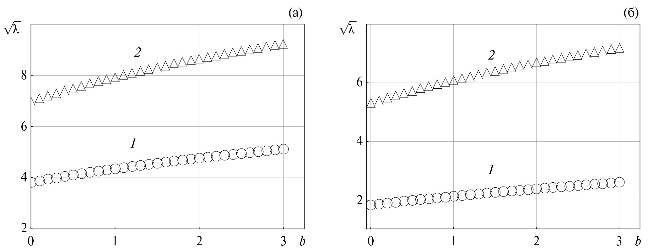 3. Рис. 2. Зависимости безразмерных собственных частот от параметра b: (а) — осесимметричные волновые моды (1) и (2); (б) — асимметричные волновые моды (1) и (2).