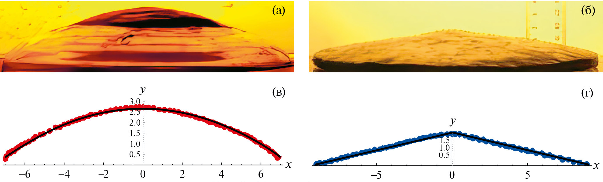 4. Рис. 3. Форма возвышения на дне сосуда (а, б) и графики аппроксимирующих профиль дна функций (в, г): (а, в), (б, г) — R0 = 7 и 9.8 см; точки — данные оцифровки фотографий (а, б).