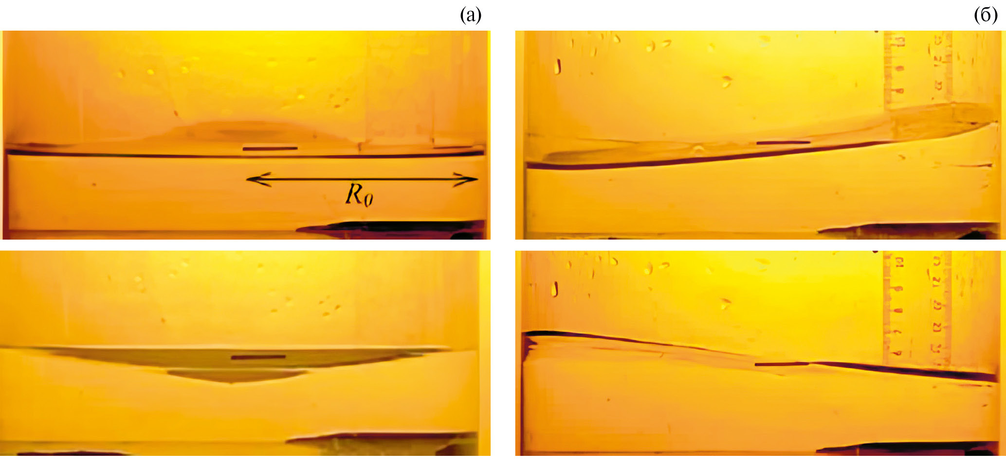 Профилированное дно представляло собой симметричное относительно оси сосуда возвышение, изготовленное из технического пластилина. На рис. 3а и 3б приведены фотографии дна сосудов с R0 = 7 и 9.8 см соответственно.