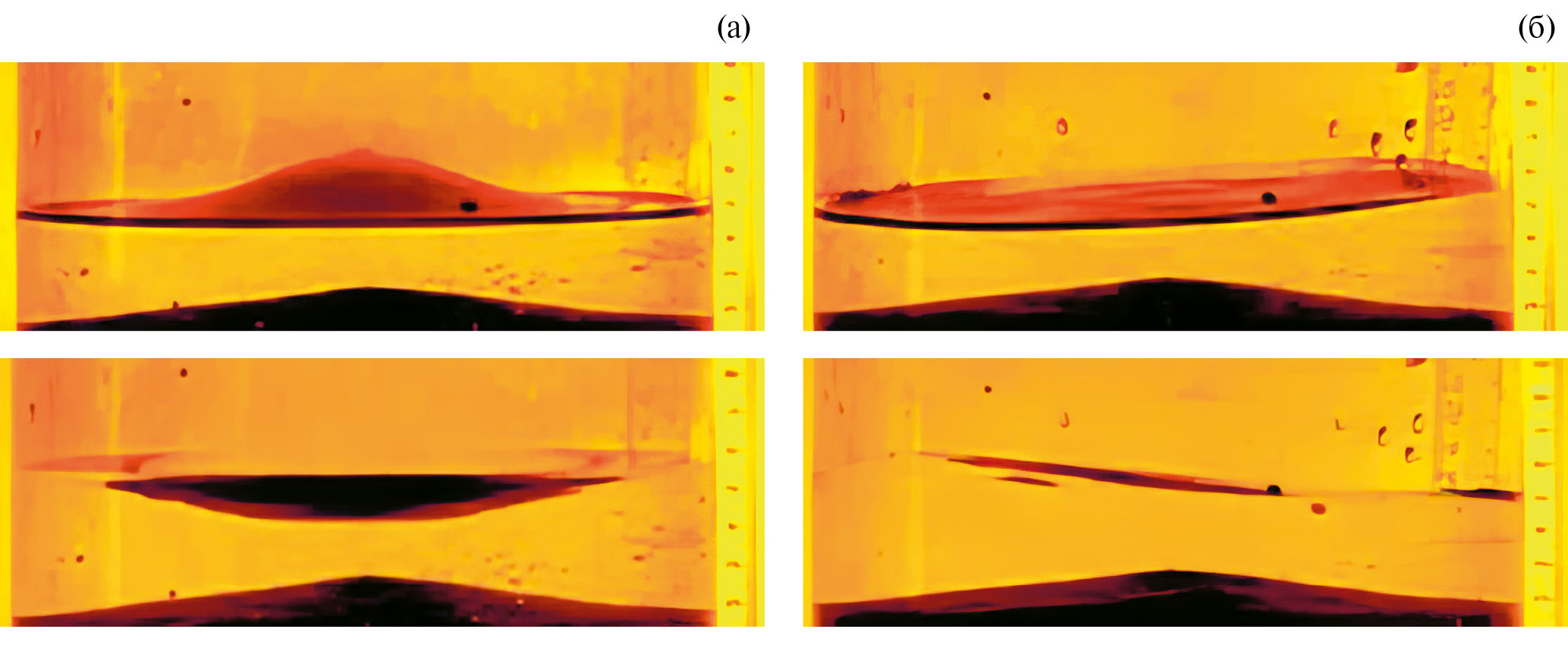 6. Рис. 5. Профили волн максимального развития в круговом цилиндре радиуса R0 = 9.8 см с коническим возвышением на дне при максимальной глубине жидкости h = 4 см: (а, б) — осесимметричная (0, 1) и асимметричная (1, 1) волновые моды.