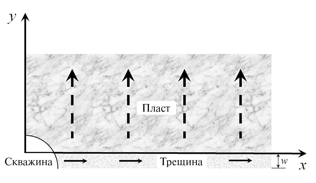 Часто из-за высоких давлений на нагнетательных скважинах образуются разрывы породы – трещины авто-ГРП. Эти трещины могут распространяться вплоть до добывающих скважин. С течением времени эти трещины промываются нагнетаемыми фильтрационными потоками и из-за эрозии стенок преобразуются в незакрепленные проппантом трещины с некоторым характерным раскрытием. В результате образуется система скважина–трещина–пласт, в которой на начальных, но довольно продолжительных временах возникает так называемый билинейный поток [1], представляющий одномерное течение в трещине и перпендикулярное трещине фильтрационное течение в пласте с прямолинейными траекториями частиц.