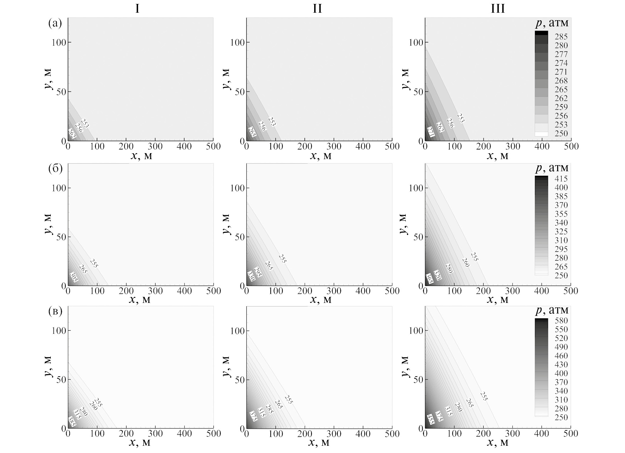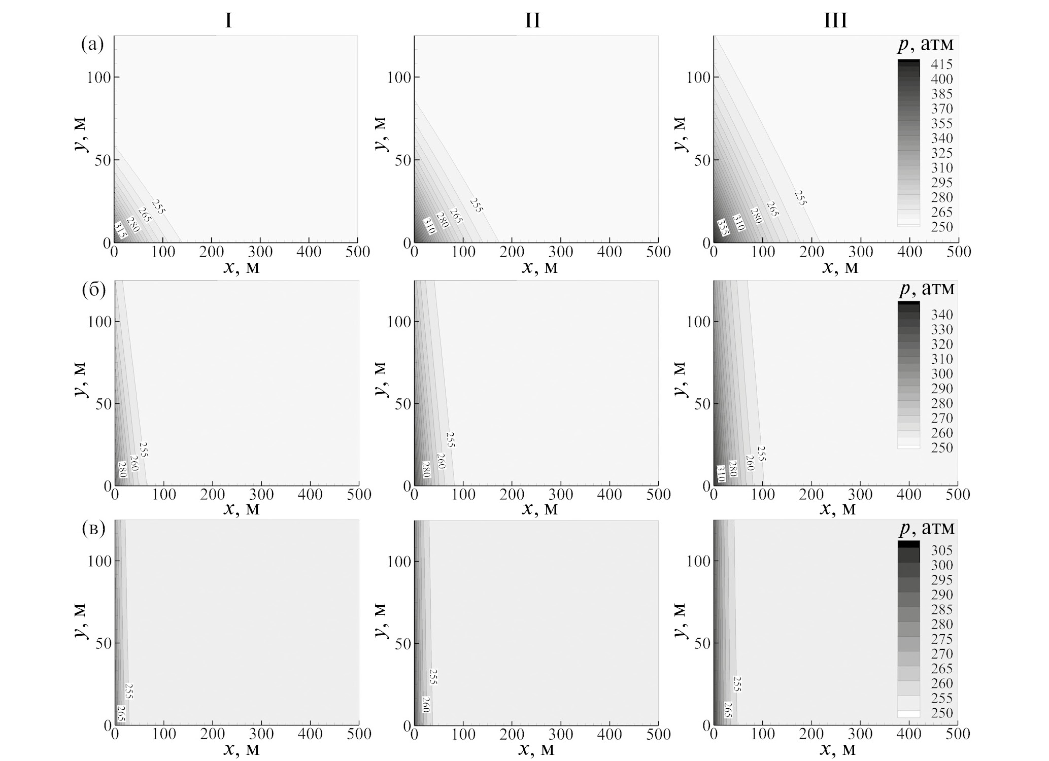 Рис. 5. Распространение давления в пласте в моменты (I–III) – t = 3, 6 и 12 ч. Ширина трещины w = 10–4 м. Проницаемость пласта k = 1 мД: (а–в) – Q0 = 10, 50, 100 м3/сут.