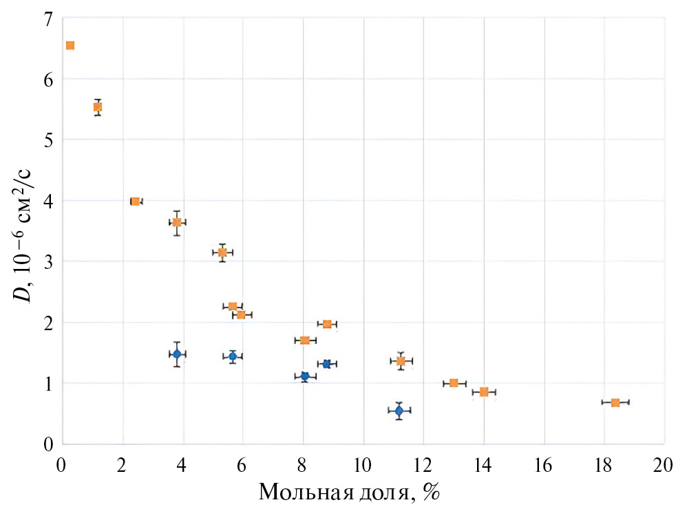 Рис. 1. Зависимость величин коэффициентов диффузии D1 и D2 от мольной доли линейных молекул полиэтиленгликоля (ПЭГ), растворенных в дейтерохлороформе CDCl3.