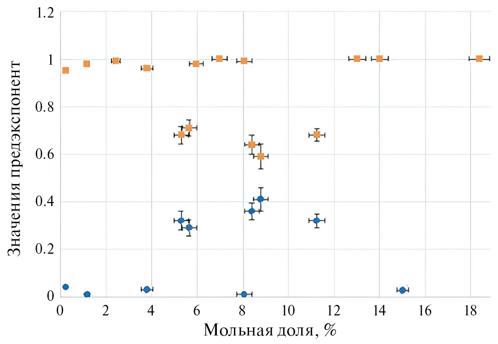 3. Fig. 2. Dependence of the values of the pre-exponential factors U1,2 on the mole fraction of linear PEG molecules in CDCl3.