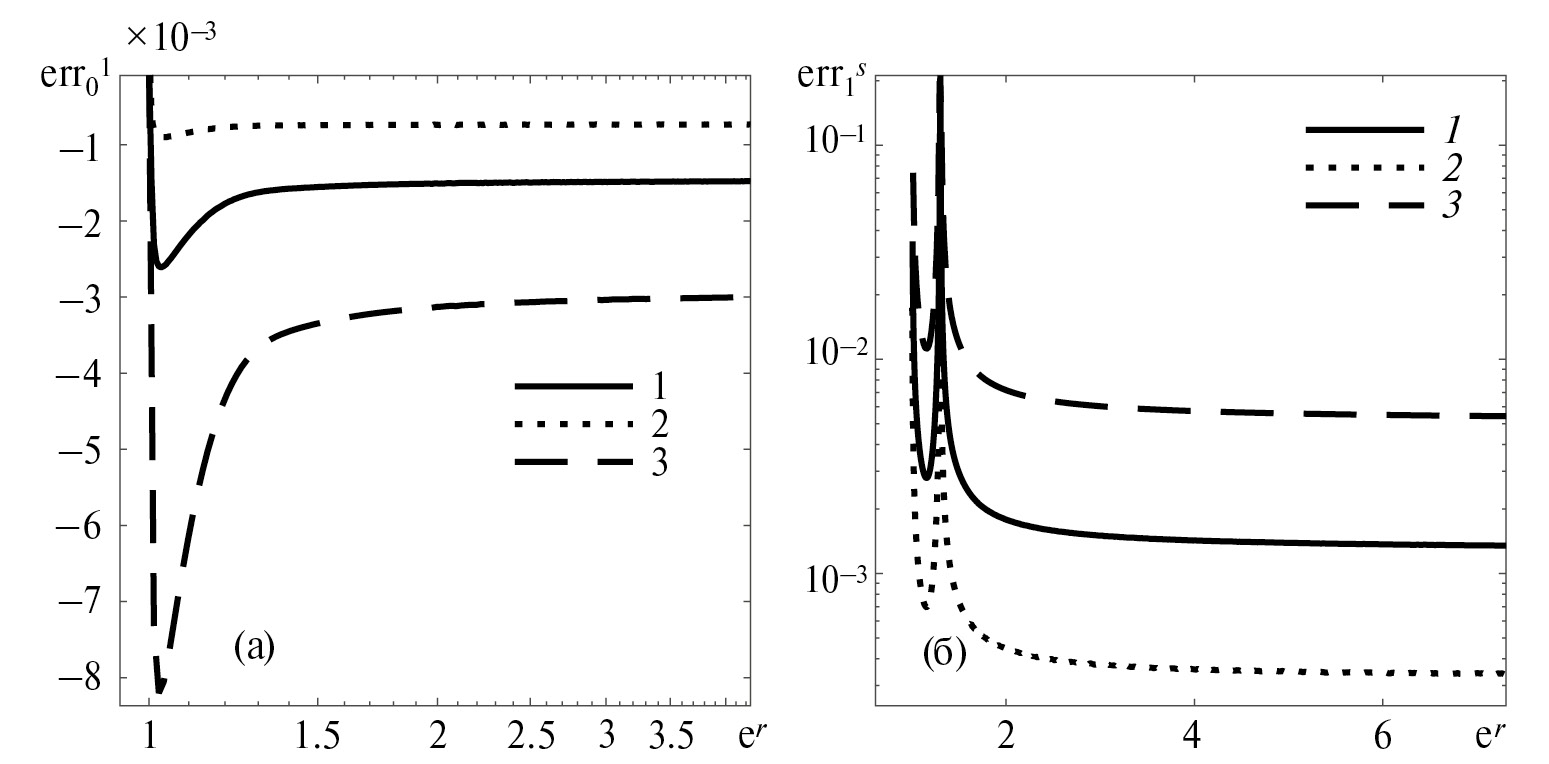 Рис. 2. Относительная погрешность численного решения ~y01 (а) и ~y0s (б) при b = 314, q = p/4, вычисленного на сетках с n = nr × nq узлов с r∞ = 3: 1 – n = 512 × 512, 2 – n = 1024 × 1024, 3 – n = 2566 × 256.