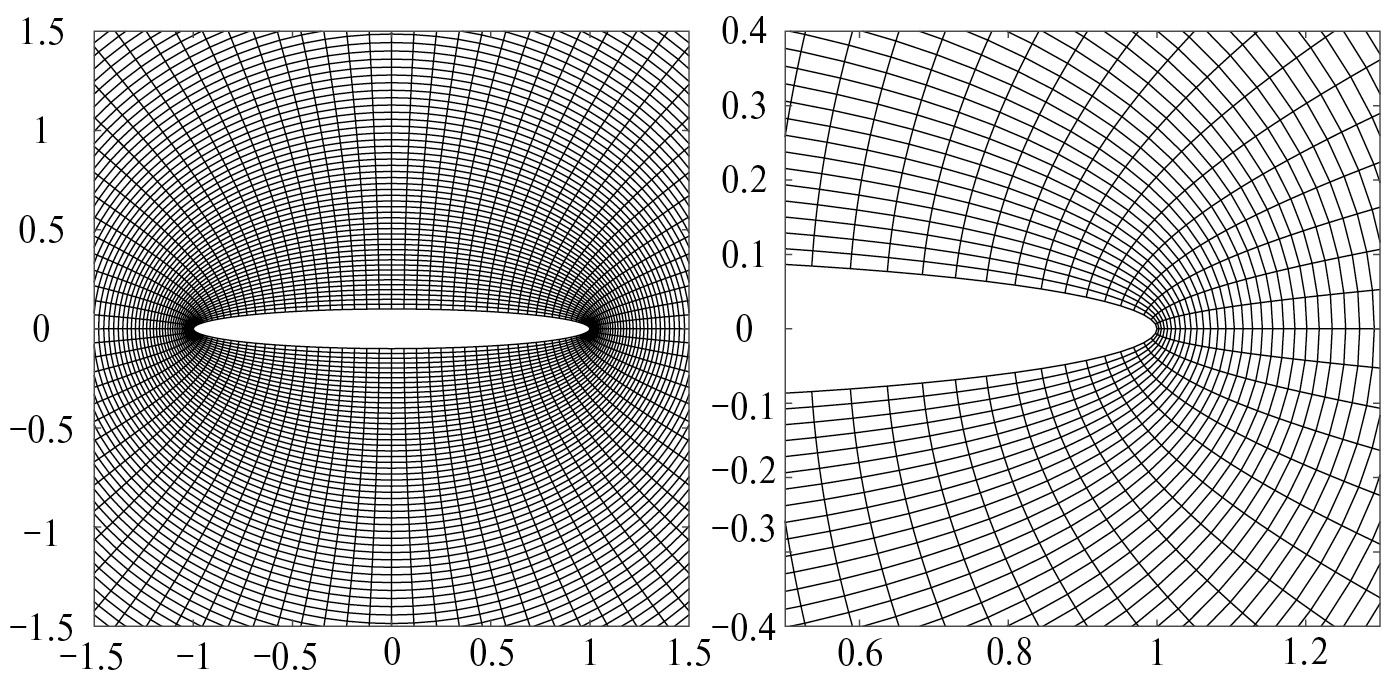 Рис. 7. Характерная структура сетки (n = 100 × 100) в окрестности симметричного профиля Жуковского при m = 0.5, r0 = 0.02.