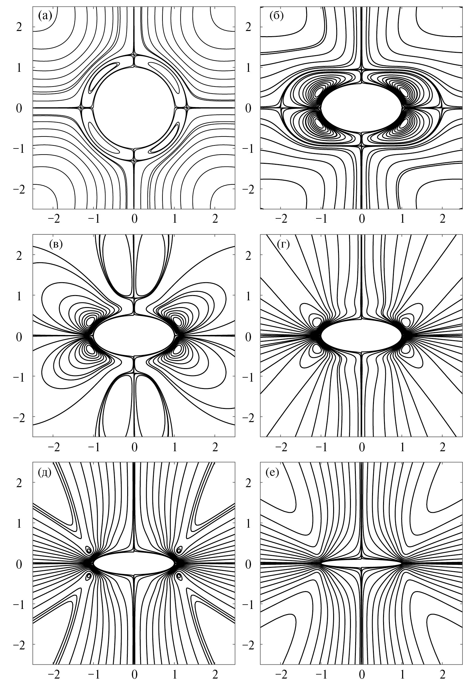 Рис. 8. Вторичные стационарные течения около кылового профиля. Линии тока для m = 0.3 (a) b = 20, ust = 0.0069k, (б) b = 50, ust = 0.0068k, (в) = 100, ust = 0.0065k, (г) = 300, ust = 0.003k, (д) = 7000, ust = –0.025k, (е) = 4 ×105, ust = 0.23k; вычислено по длине хорды.