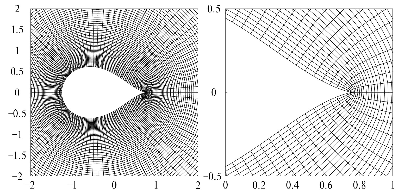 Здесь x, y, l2 записаны в виде вещественных функций от вещественных переменных в той форме, в которой они использовались в программной реализации. Для получения классического профиля с острой кромкой нужно выбрать r0 = 0, при этом сама кромка становится особой точкой в которой, в частности, l2 обращается в ноль. Для проведения расчетов профиль скруглялся, и значение r0 выбиралось равным 0.02. Форма профиля и структура расчетной сетки в физической области для этого случая представлены на рис. 7.