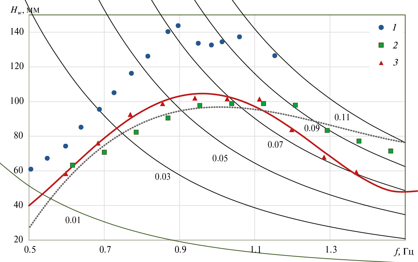 Рис. 1. Зависимость высоты волн Hw от частоты работы клиновидного волнопродуктора, пунктирная и красная линии — аппроксимации 3-го и 2-го режимов генерации волн полиномами. Нанесена сетка линий постоянной крутизны волн при глубине 950 мм (тонкие линии, числа около кривых — значения крутизны волн). 1 — максимальная амплитуда качения клина, 2, 3 — средняя и минимальная амплитуда соответственно.