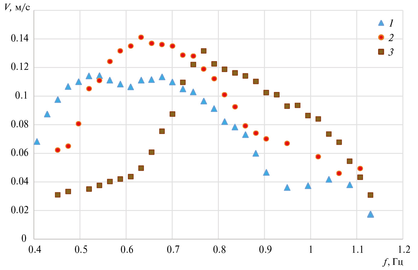 Рис. 9. Зависимости скорости от частоты волн при различной высоте волн. 1 — min, 2 — mid, 3 — max.