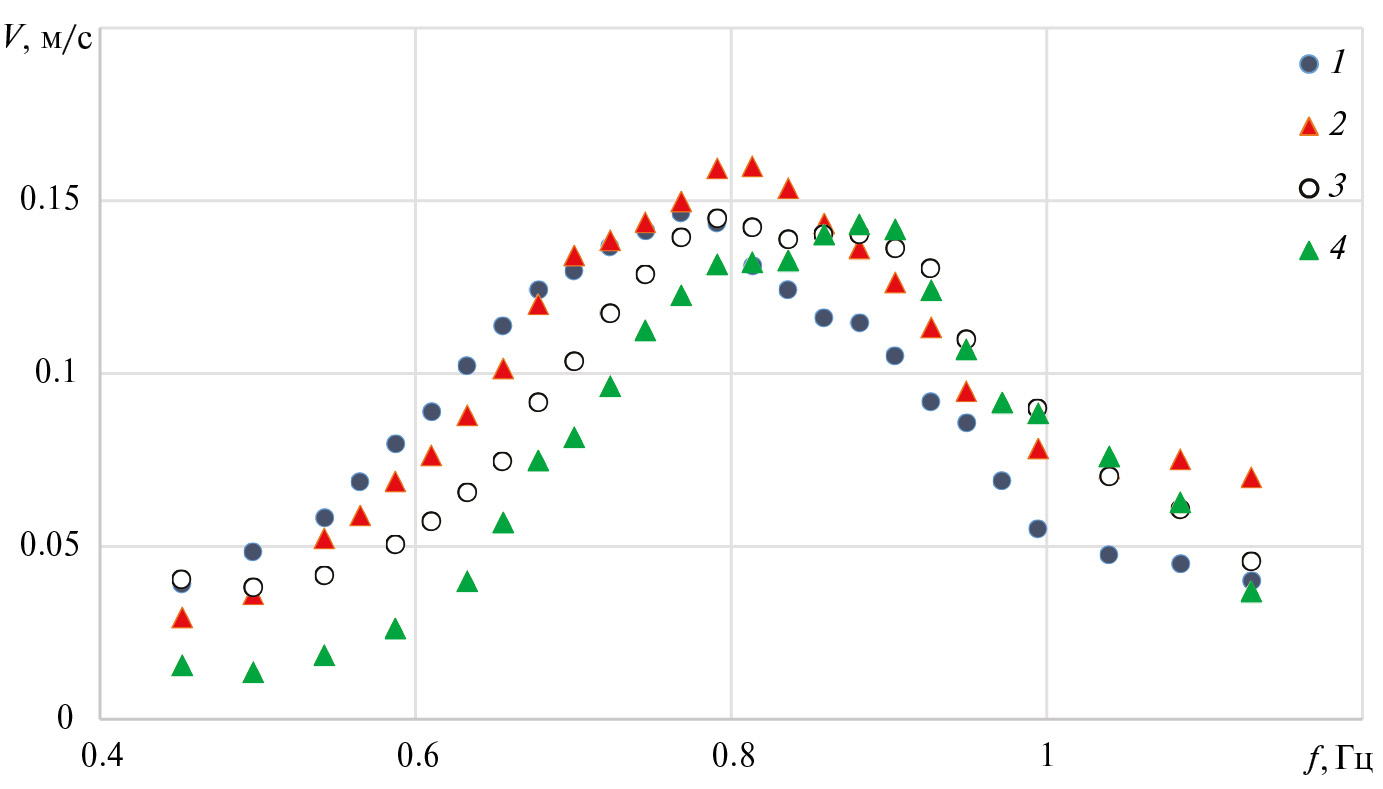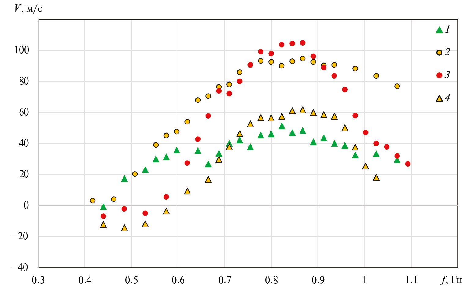 Рис. 12. Зависимость скорости от частоты волн для пластин с одинаковыми положением верхней кромки (0 мм) и заглублением нижней кромки (70 мм) при различных углах наклона пластины: 20°, 30°, 45°, 60° (1–4).